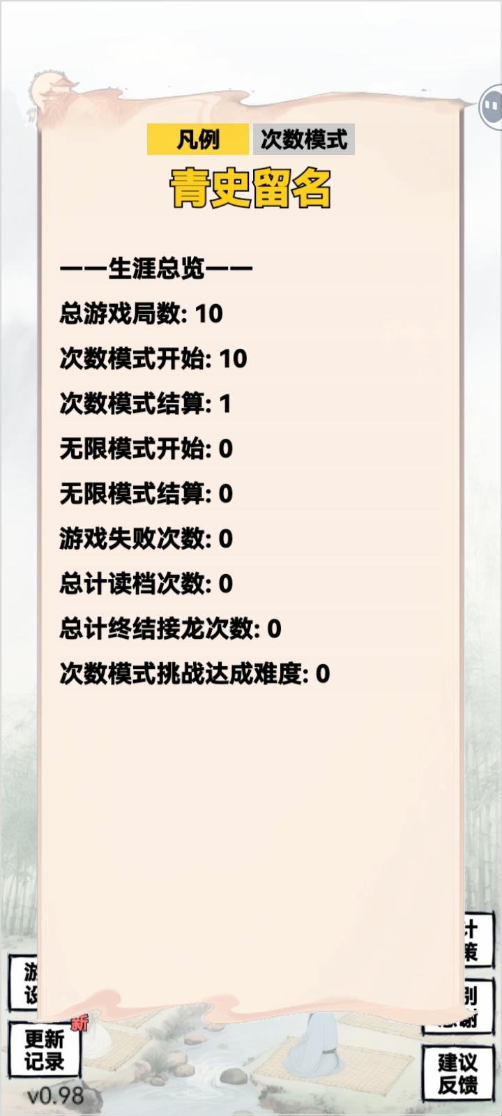 建议无限模式改一下闯关方向,初始全BUFF,每升一级随机减少一个BUFF。现在的无限模式500+以后根本死不掉,而且反反复复就这几个成语,思考时间越来越短导致没时间去想其他词,就很鸡肋。