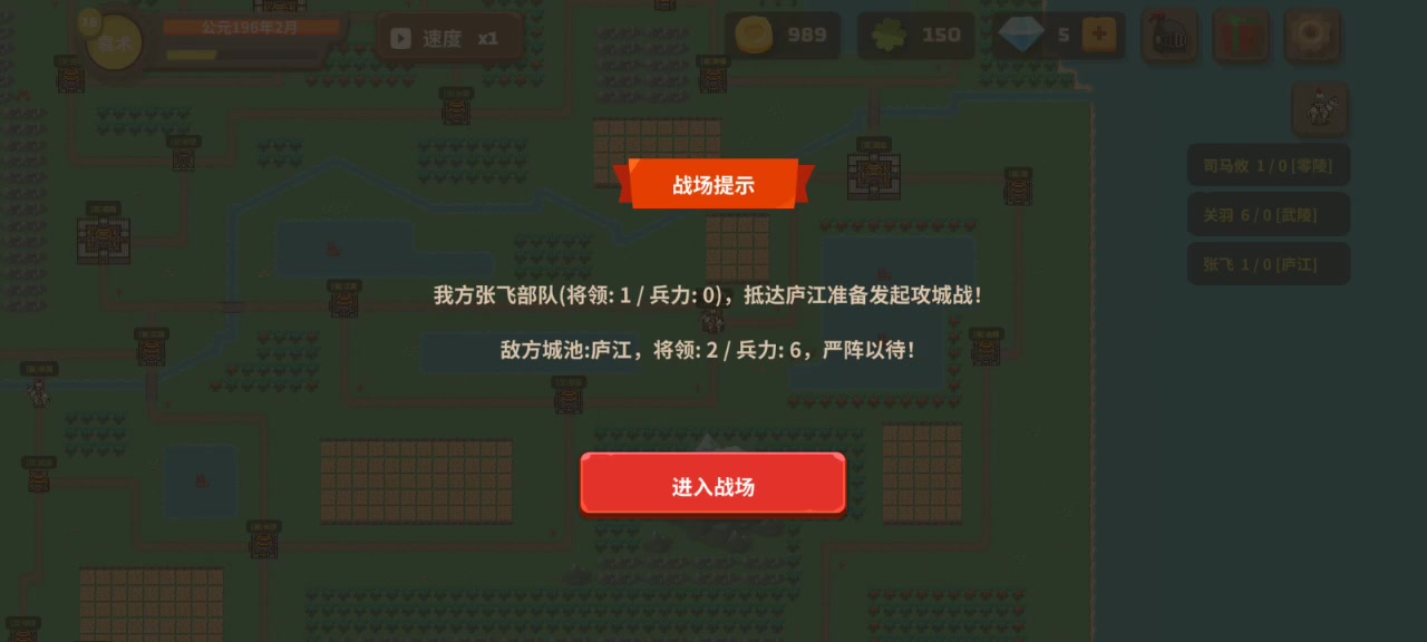 前期缺粮,不太方便大规模进攻,所以我们随便派一个远程技能去打,只要15粮草能打就打,打不过就撤退到其他城继续打,15粮草换一个城划算