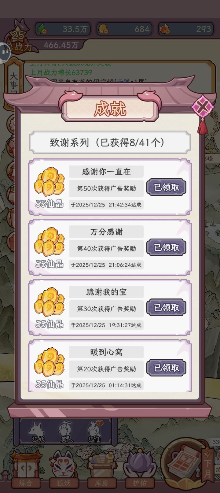 3.游戏本身存在一定bug,比如说成就和图鉴奖励部分领取不到账的问题,尤其是狐仙的图鉴,领取的全部都不到账,希望官方修复
