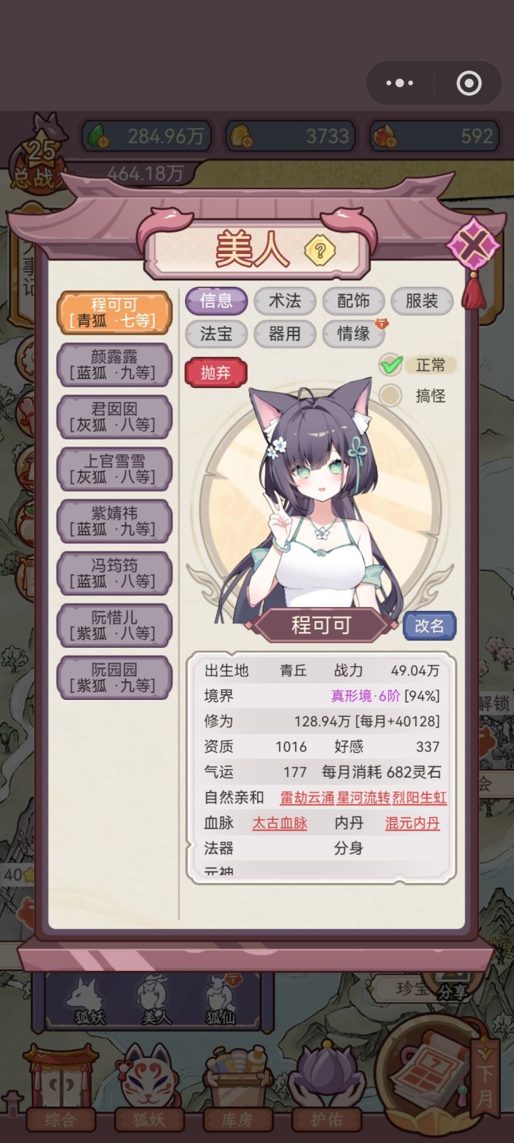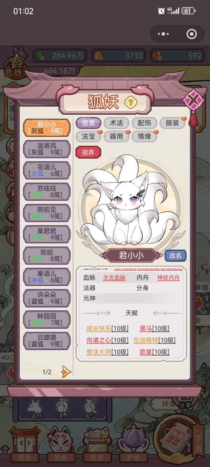 首先再次强调:root机才能用此存档!!!(虚拟机能root大概也是可用的) 最近根据论坛某Z字开头的大佬提供的信息,我花了一天时间去研究,然后如图所示,做出了一个2⭐开局但是有24只满26天赋狐(示例图每张都有同一只天狐的加成,每月收支汇总是狐妖捐献)的高资源存档。(PS:图是我测试得差不多了才截的,所以有二十多星)如果有想要的的可以先安个眼,我打算这几天抽空传个盘,弄完后再看是发评论还是私信