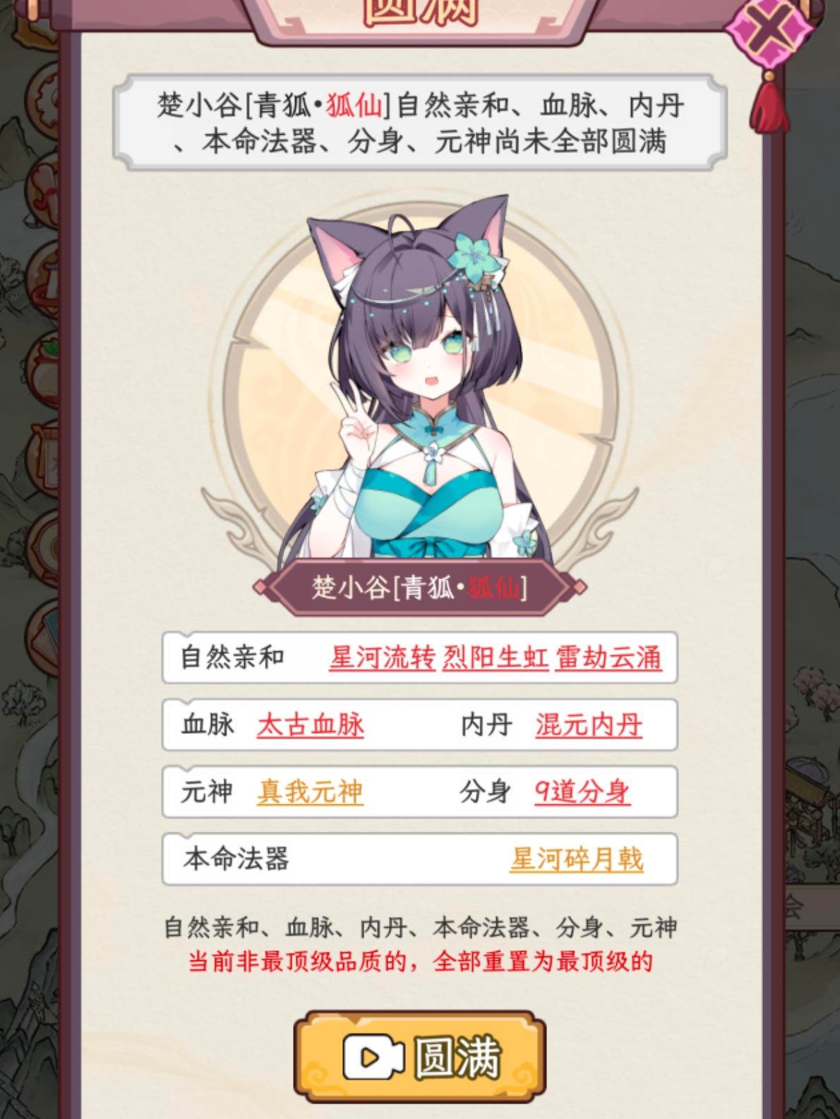 笑死,这个圆满功能不说把内丹升满就算了,还把好好150的混元内丹降低成了120的神纹内丹了。还有就是这部就不能不开后宫每种狐狐只养一两只嘛,非要养那么多的话,你送礼能不能多几种自动选项啊,我不想只养最好的,我想公平点想雨露均沾大家都有份!