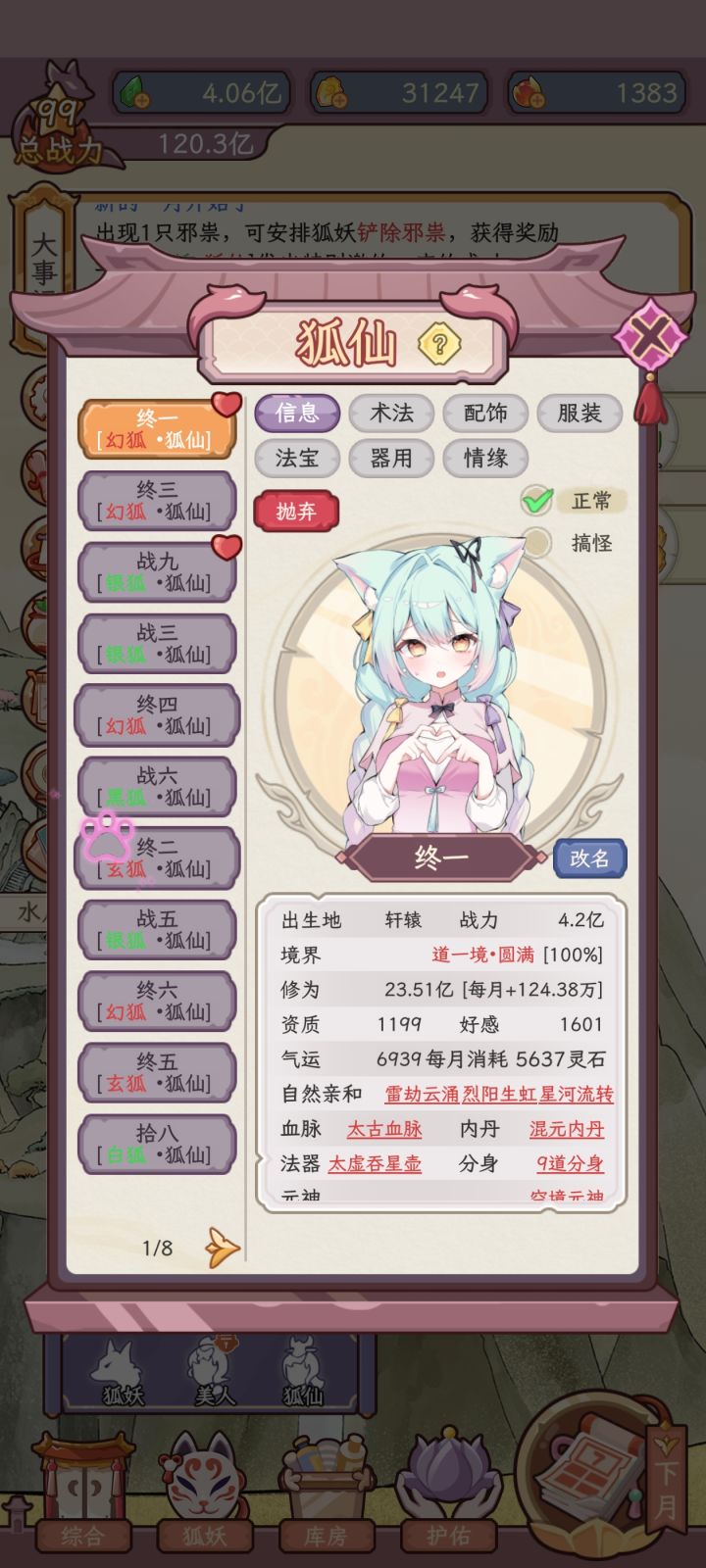 图中小狐狸的资质就是游戏中最顶尖的六个,拥有这六个资质的狐狸,后面成长起来绝对是战力最高的,我是直接新手机重开了一个号,我老号已经满级了,玩完之后有挺多后悔的地方的,地点有很多攻略介绍,我就不多赘述了。稍微说一下在游戏中需要注意的地方吧。1,天赋按我图中狐狸的这六个找,如果有六边形就直接拿下,又增加战力的天赋才是最好的,这游戏修为系统做的稀烂,增加修为,不增加战力。可以说,修为除了让你化形一点卵