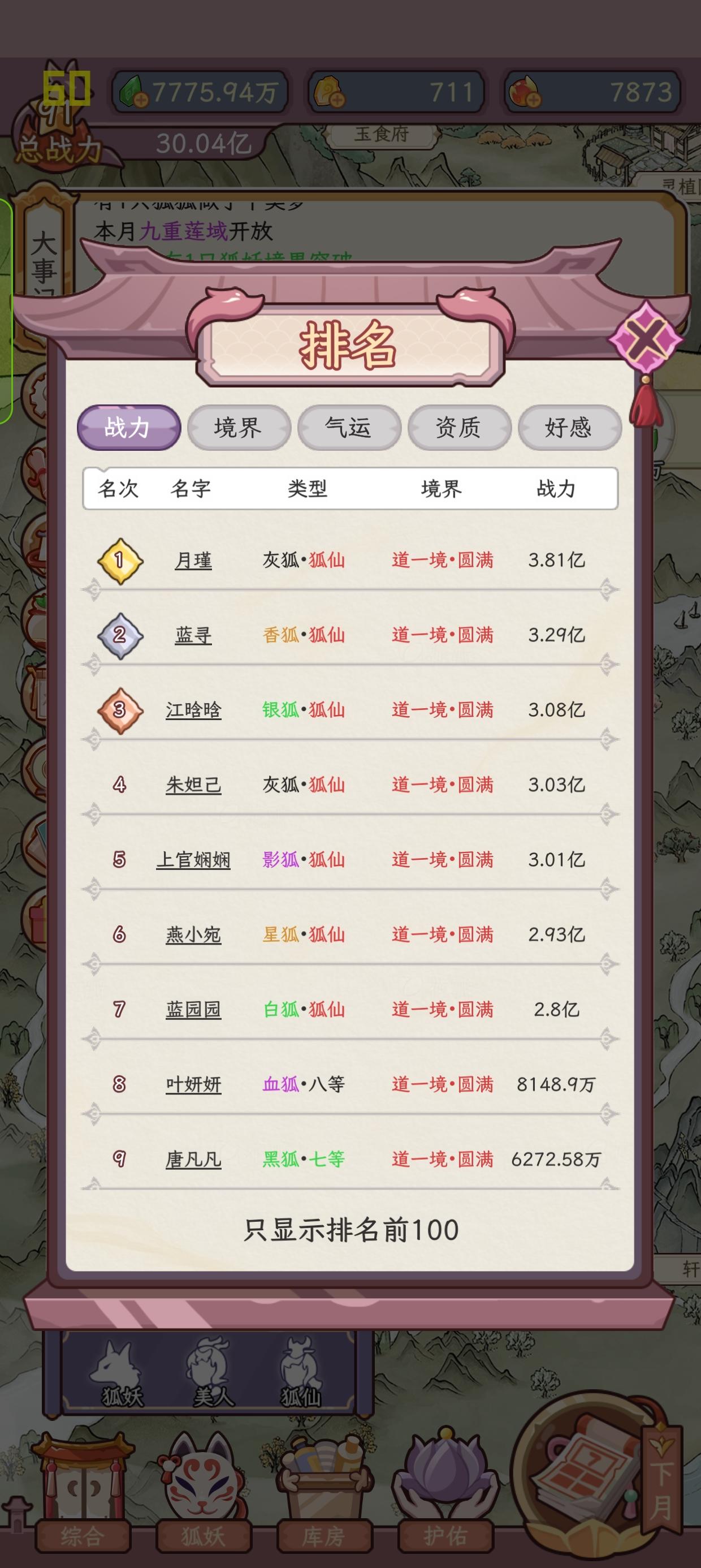 如图,为了小狐妖着想,基本上不到亿战力不会去提升评级,但玉颜阁提升战力似乎有数值上限,九重莲域和本命武器似乎没有(或阈值更高)