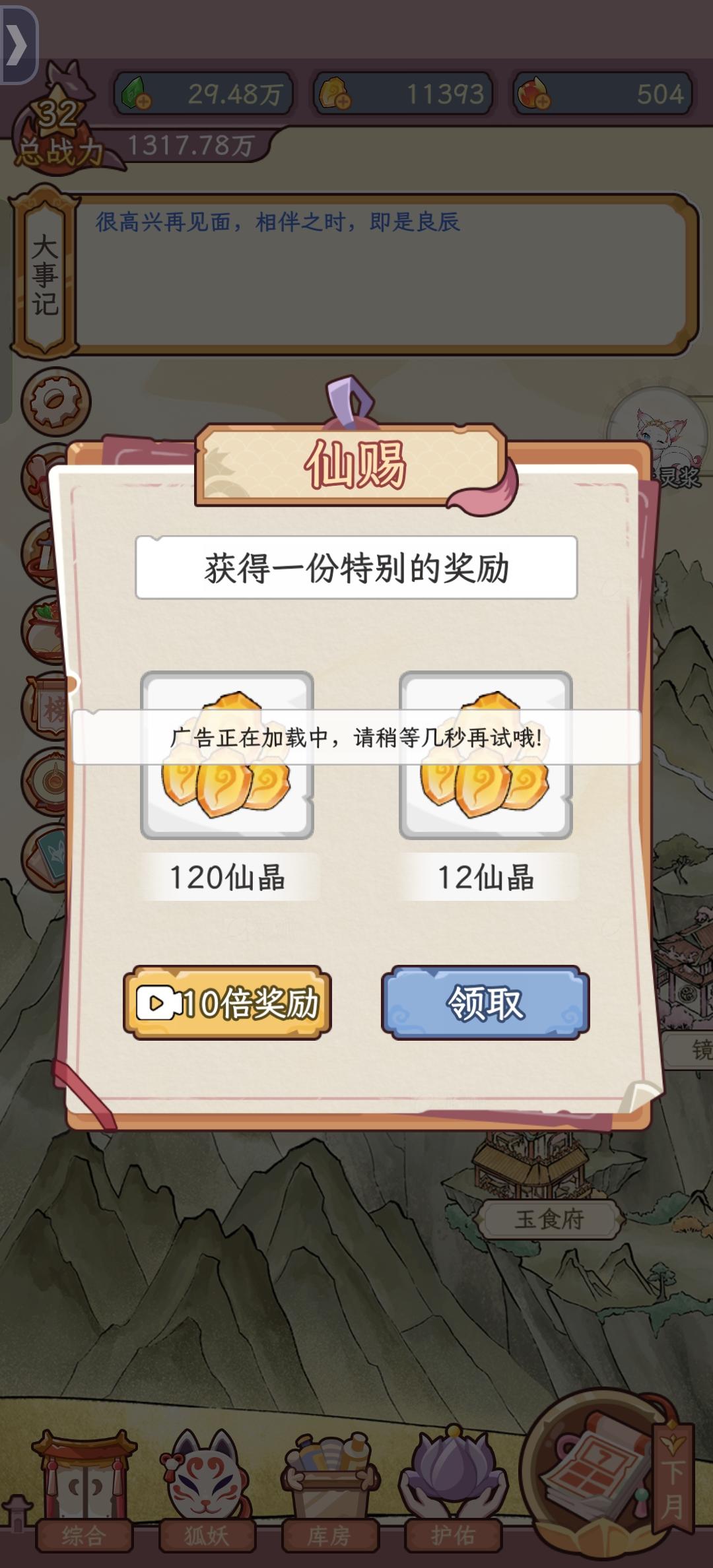 忍你一个小时了,还是看不了广告,我是不介意看广告的,没上科技一天看了400+广告了,但是你现在不让我看广告是什么意思?试了不管是天赋还是仙晶亦或是挂机奖励都看不了,今天已经出现过无数次这种情况了,每次都要等个几分钟乃至十几分钟才能看,现在是一个多小时了还是不能看,你到底让不让看广告,不让看就早说,浪费我时间在这等