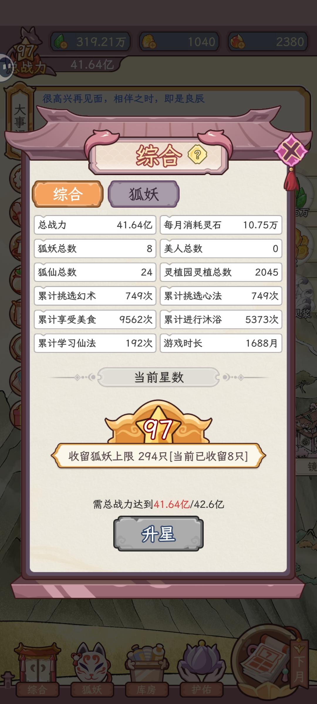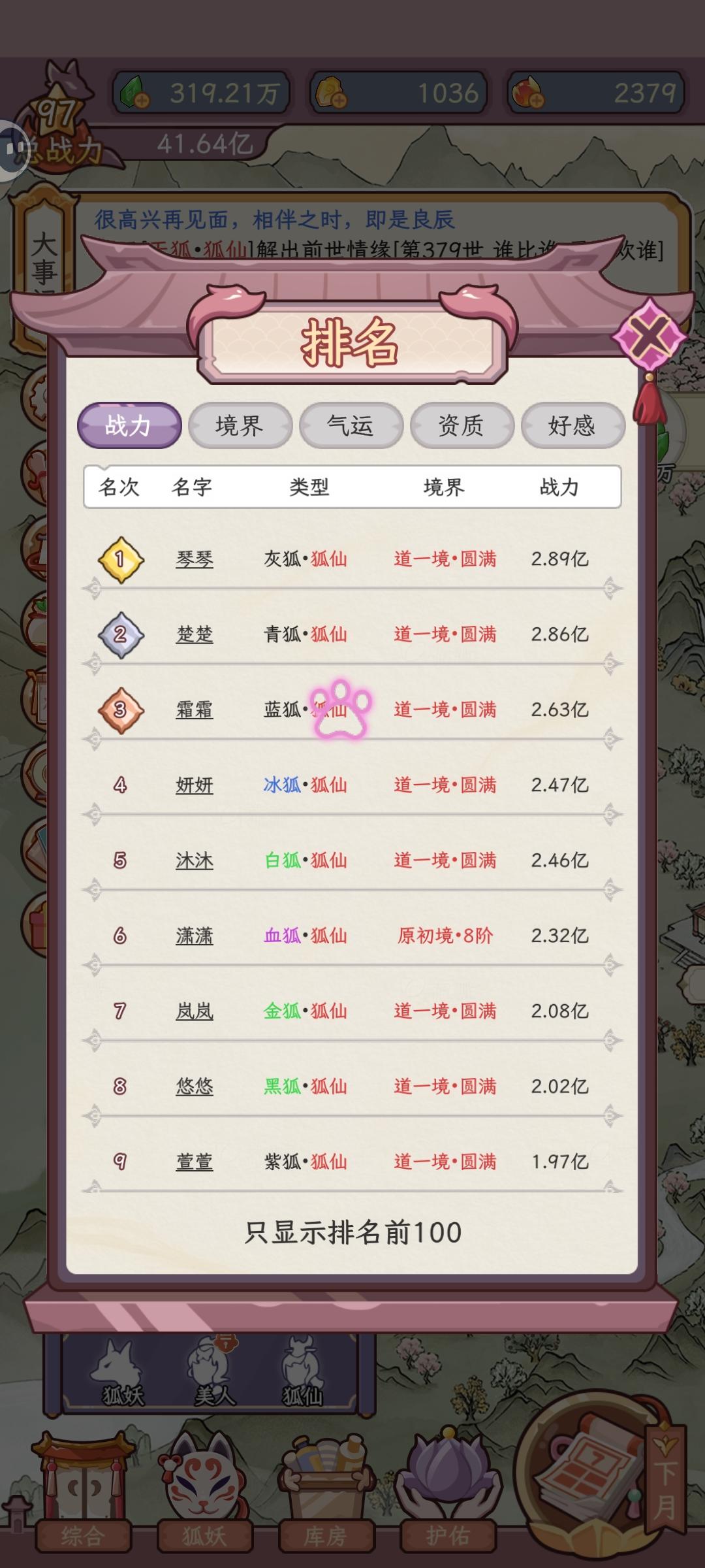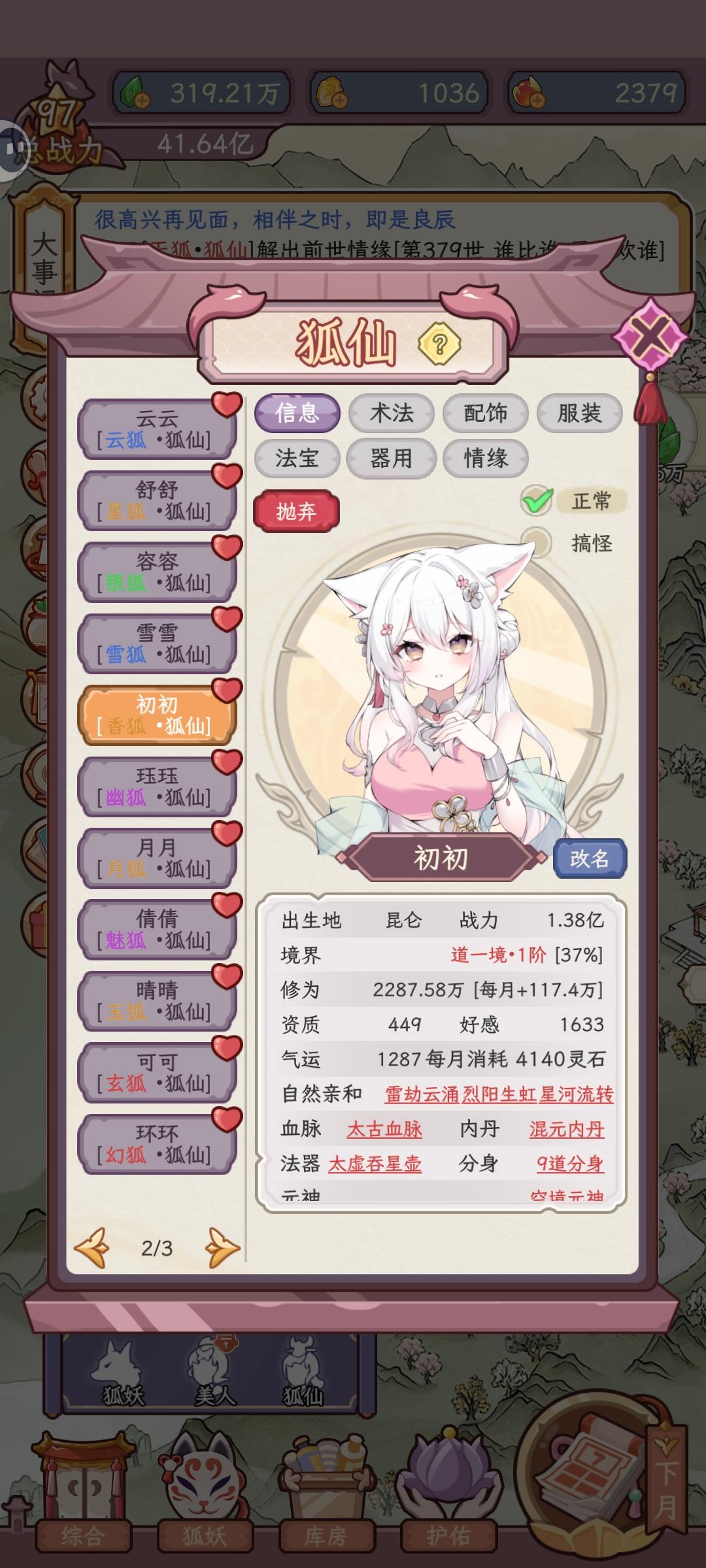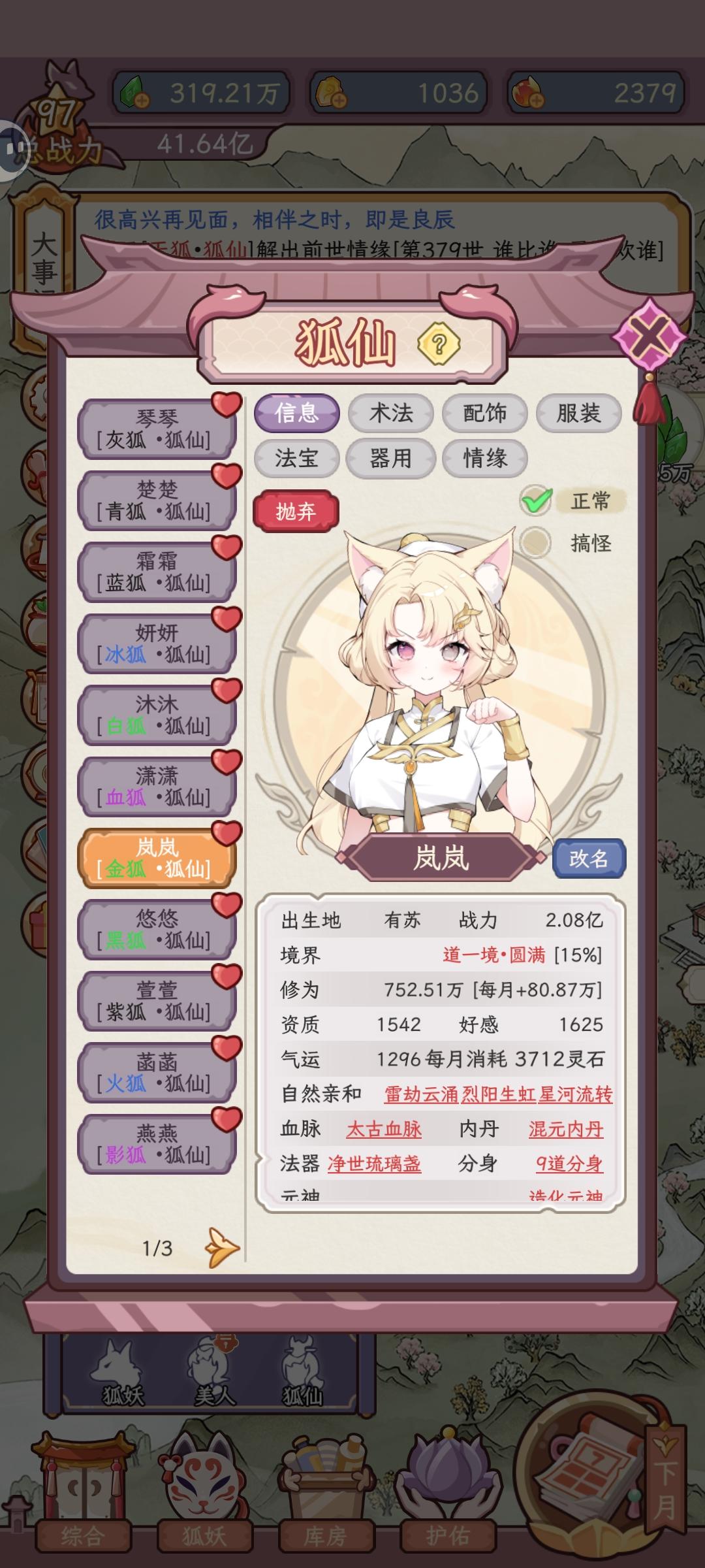 这是我的第2个存档,三天10个小时。第1个存档,因为游戏bug直接崩了,没了。(不要乱踢狐狸,有可能存档就没了)我来说一下我的感受吧,你们说的广告问题确实很多,但是想像我这么快,10个小时,有狐狸成仙。前期看几个广告算了,中期用活宝快速提升战力,后期再看广告。累积目前看了70个,后期看广告收益大。魔千雪这个狐狸我最不看好他,术法也最差,那个时候我压根没升级术法,都是蓝绿色,根本没有橙紫色。偏偏他
