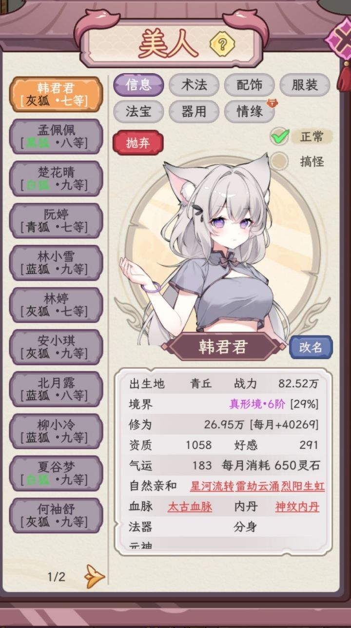 能净化怨念拿东西就行 后面天赋已经不重要了反正战力够打怪就可以了 气运学术法 资质加修为增长 天赋好看其实就行 追求战力可以刷一下 能不能解决一下狐妖只能靠下个月随机祈愿加气运 气运不够学不了术法真的蛋疼 难道要我搞道一圆满化形的狐妖吗