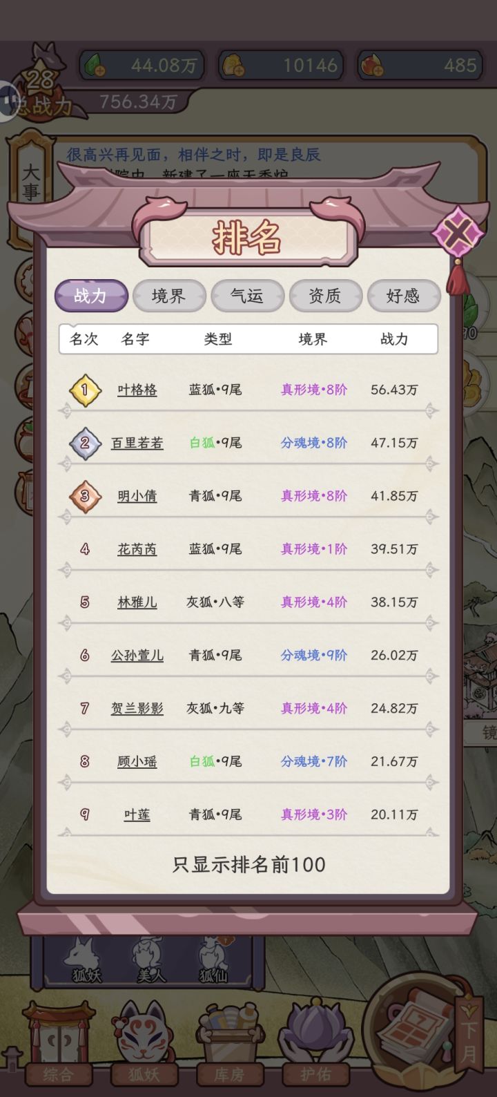 图中小狐狸的资质就是游戏中最顶尖的六个,拥有这六个资质的狐狸,后面成长起来绝对是战力最高的,我是直接新手机重开了一个号,我老号已经满级了,玩完之后有挺多后悔的地方的,地点有很多攻略介绍,我就不多赘述了。稍微说一下在游戏中需要注意的地方吧。1,天赋按我图中狐狸的这六个找,如果有六边形就直接拿下,又增加战力的天赋才是最好的,这游戏修为系统做的稀烂,增加修为,不增加战力。可以说,修为除了让你化形一点卵