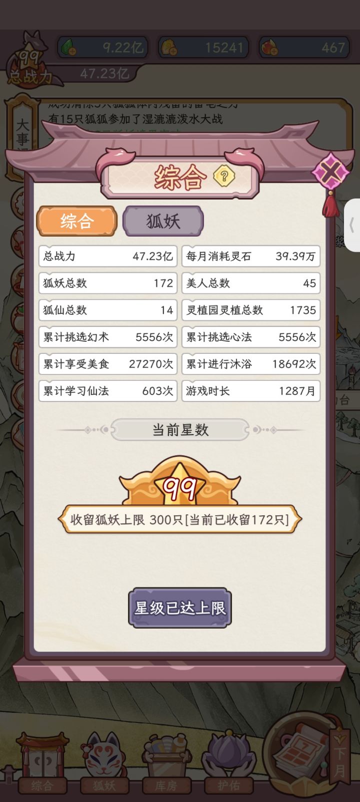 图中小狐狸的资质就是游戏中最顶尖的六个,拥有这六个资质的狐狸,后面成长起来绝对是战力最高的,我是直接新手机重开了一个号,我老号已经满级了,玩完之后有挺多后悔的地方的,地点有很多攻略介绍,我就不多赘述了。稍微说一下在游戏中需要注意的地方吧。1,天赋按我图中狐狸的这六个找,如果有六边形就直接拿下,又增加战力的天赋才是最好的,这游戏修为系统做的稀烂,增加修为,不增加战力。可以说,修为除了让你化形一点卵