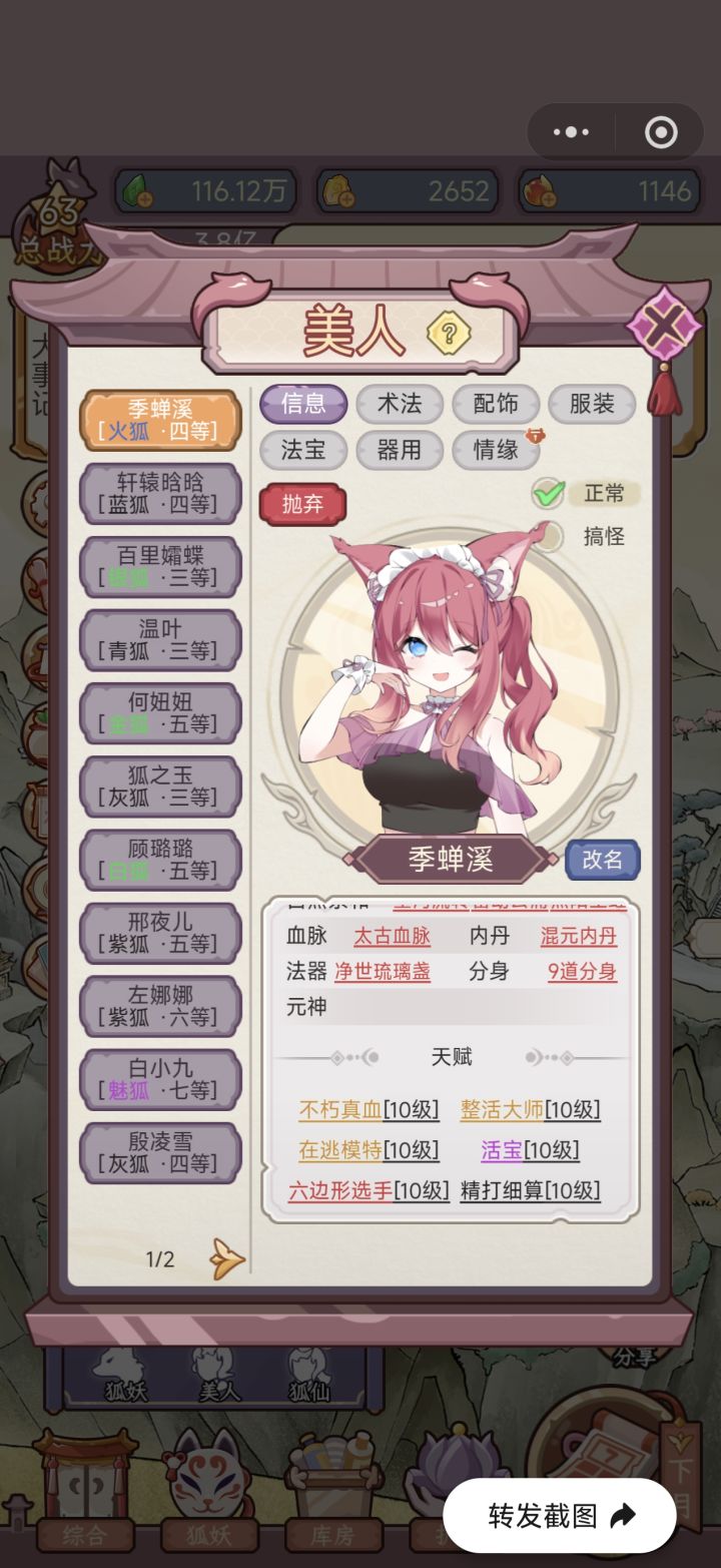 看天赋都差不多啊!甚至我的主养狐(轩辕晗晗)修炼的还快,因为火狐名字不好听所以就改了名,自从火狐叫季蝉溪后,我的主养狐就慢慢被弯道超车了,超了整整600多万战力,真就那句“人间生我季蝉溪,从此天才尽低眉”