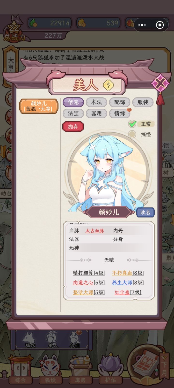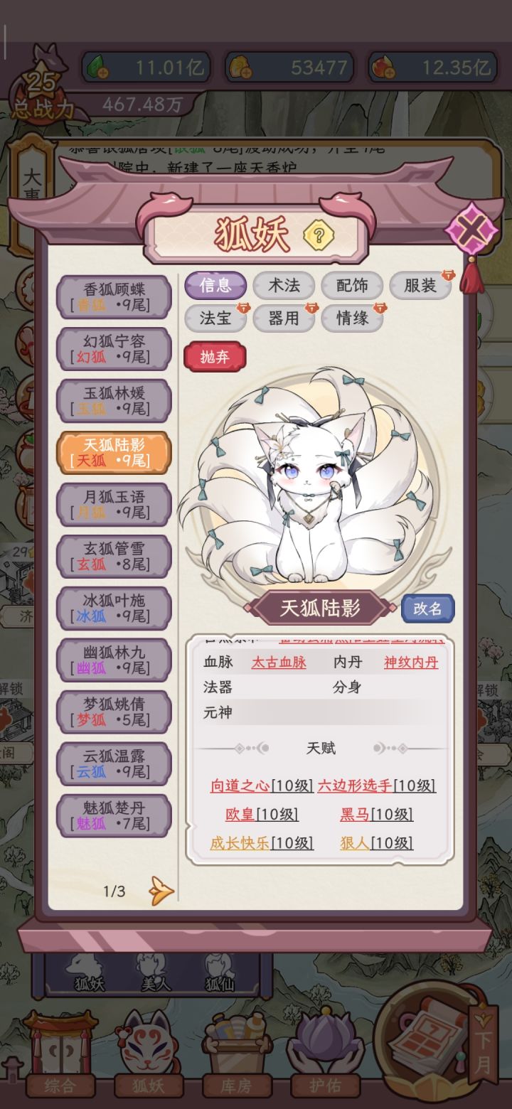 首先再次强调:root机才能用此存档!!!(虚拟机能root大概也是可用的) 最近根据论坛某Z字开头的大佬提供的信息,我花了一天时间去研究,然后如图所示,做出了一个2⭐开局但是有24只满26天赋狐(示例图每张都有同一只天狐的加成,每月收支汇总是狐妖捐献)的高资源存档。(PS:图是我测试得差不多了才截的,所以有二十多星)如果有想要的的可以先安个眼,我打算这几天抽空传个盘,弄完后再看是发评论还是私信