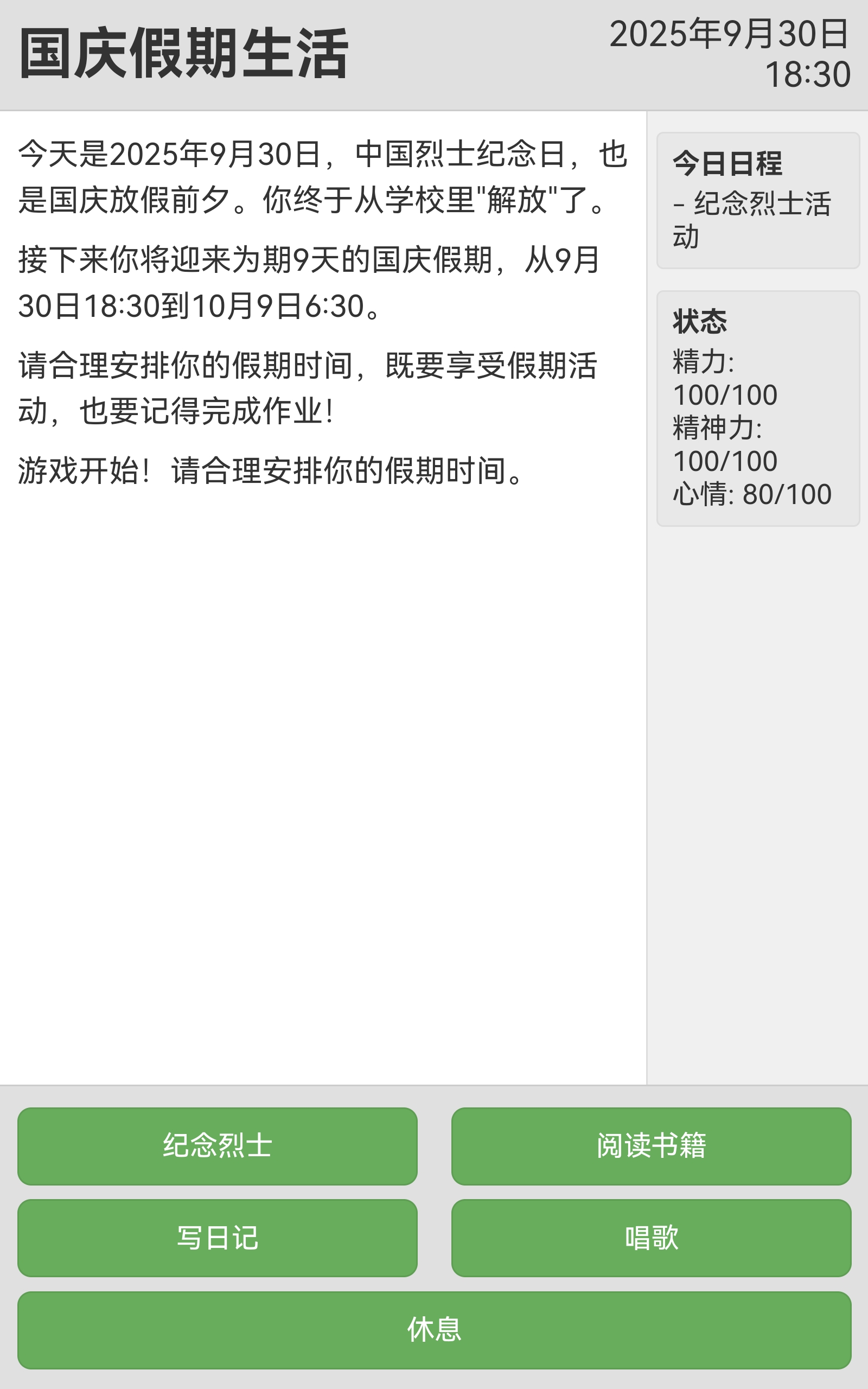《未完成的作业:国庆》是一款充满乐趣与休闲氛围的文字游戏。游戏设定在一个国庆和中秋的假期,玩家扮演一名学生,在游戏中度过有意义的八天假期。 玩家需要在八天时间内,选择参与各种活动或者选择休息,来推进游戏进程。在这个过程中,玩家需要消耗精神力来参加活动,并通过休息来恢复体力并继续活动。 游戏的结尾...