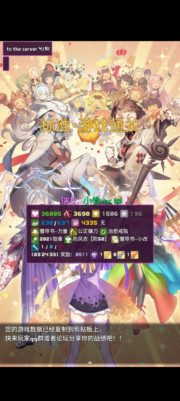 瑞比&小怜游戏种子:[85413944]初始奖励等级:12----区域2---00:19:56血量:491/攻击:61防御:61/魔防:60金币:86/等级:12装备:魔导书-小改/未解锁/未解锁未解锁/未解锁/未解锁钥匙:2/0/1----区域3---00:40:15血量:177/攻击:172防御:172/魔防:84金币:1325/等级:21装备:魔导书-小改/急