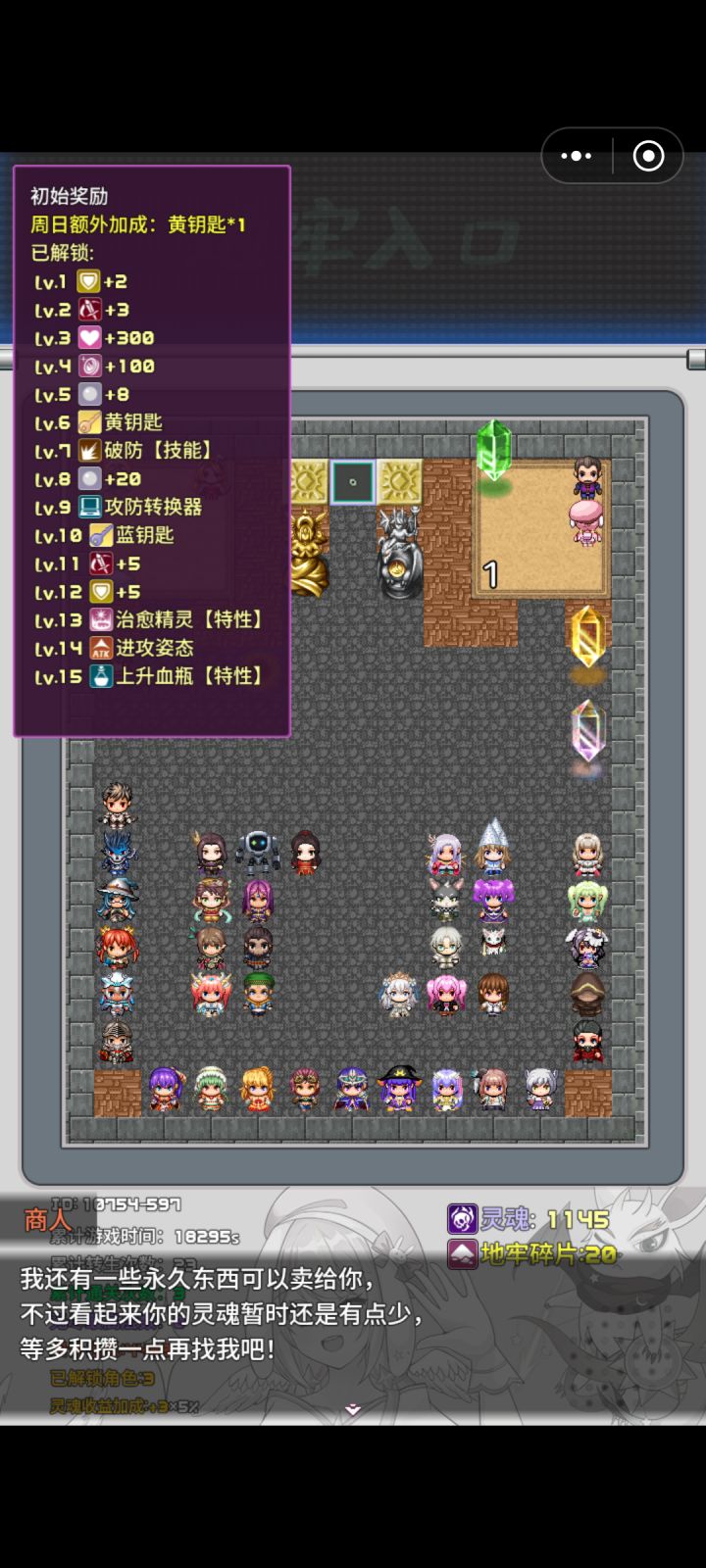 妖狐初始两个自选,粘稠血液和那个魔防到100每次战斗概率+1魔防,主要就是前期被动升级了,升级到每战斗+8魔防,猛猛刷,后面就是开吸血一路创,我从300多层就被封印折磨,折磨到1500层,后面封印了把一层怪清了都解不开,然后解开打两下又被封印,一下子从2自选变15自选游戏种子:[68786315]初始奖励等级:15----区域2---00:06:31血量:5067/攻击:X防御:25