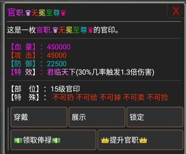 官印具备攻击血量防御加成。满级15级官印有“君临天下”特效,30%几率触发1.3倍伤害。另外每天可领取俸禄。首先,战功商城买一个“仁勇校尉”,佩戴。一、提升官职提升官职需要消耗战功战功获取方式:①每天20:00~21:00,平安镇-永宁关,站岗1小时②21:00-22:00,平安镇-平安广场-叶霜,进入战场反攻,双倍战功,无埋伏。(这个强烈推荐必做)③其他时间,每10分钟刷新“征召使