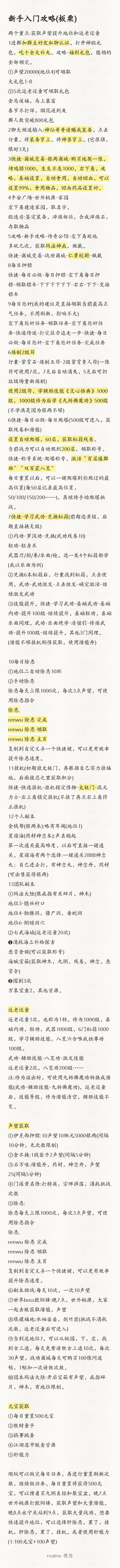 11挂机(初期挂太极门,再根据自己实力挂福地,后面挂忍之里获取积分)快捷-快速挂机-挂机锁定怪物-太极门-混元力士-右上角锁定挂机(不挂了再点右上角停止挂机)12个人副本金钱帮(银两本):略有耳闻(地位1)星宿海(药材神念本):声名鹊起第一次通关最高难度,以后可直接一键通关。星宿海有两个选择:一键通关2888神念丸;自己进去打,有神念丸,神念丹,药材(可出售获得银两)13团队副本①玛