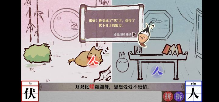 试玩的三个篇章包括引导篇章,都是传统故事中耳熟能详的神话故事或者是传统故事,在引导篇章《梁山伯与祝英台》中能看见作者整个游戏的游玩构思设计:是把拆字嵌入诗词中,而拆字又融入画面和点击式交互,实在是太新颖了。比如:“人”走到小狗面前,就是“人”+“犬”,狗是蜷伏在地上,“伏”字就应运而生。在场景中切换和寻找关键物品或动植物又能获取新的文字,文字能通过拆解边旁部首,重新排列组合,拼合得到新与诗句相对应的字。