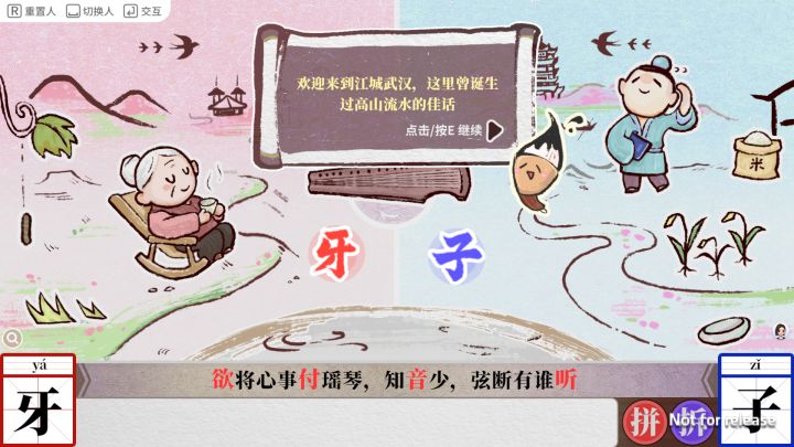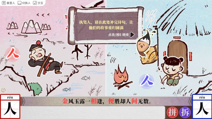 PC端体验了下,玩法规则和梦蝶有几分像,都是拆字和组合字。创新了左右屏玩法模式,带有一定解谜元素,体验有点像双人成行。两边的人可以自由切换,通过与不同人、物交互形成新的汉字,寻找出可用字体,最终将诗句中的字填充完整即可过关。