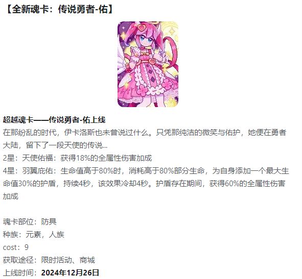 介绍:传说勇者-佑将在12月26日上线,是一张有着高达78%元素伤害加成的超越魂卡,本篇攻略就给大家带来新魂卡上线之后的各个场景的魂卡搭配。 (哪里有问题可以跟我说一下) 一、魂卡介绍 1.魂卡效果 2星:天使佑福:获得18%的全属性伤害加成。 4星:羽翼庇佑:生命值高于80%时,消耗高于80%部分生命,为自身添加一个最大生命值30%的护盾,持续4秒,该效果冷却4秒。护盾存在期间,获得60%的全属