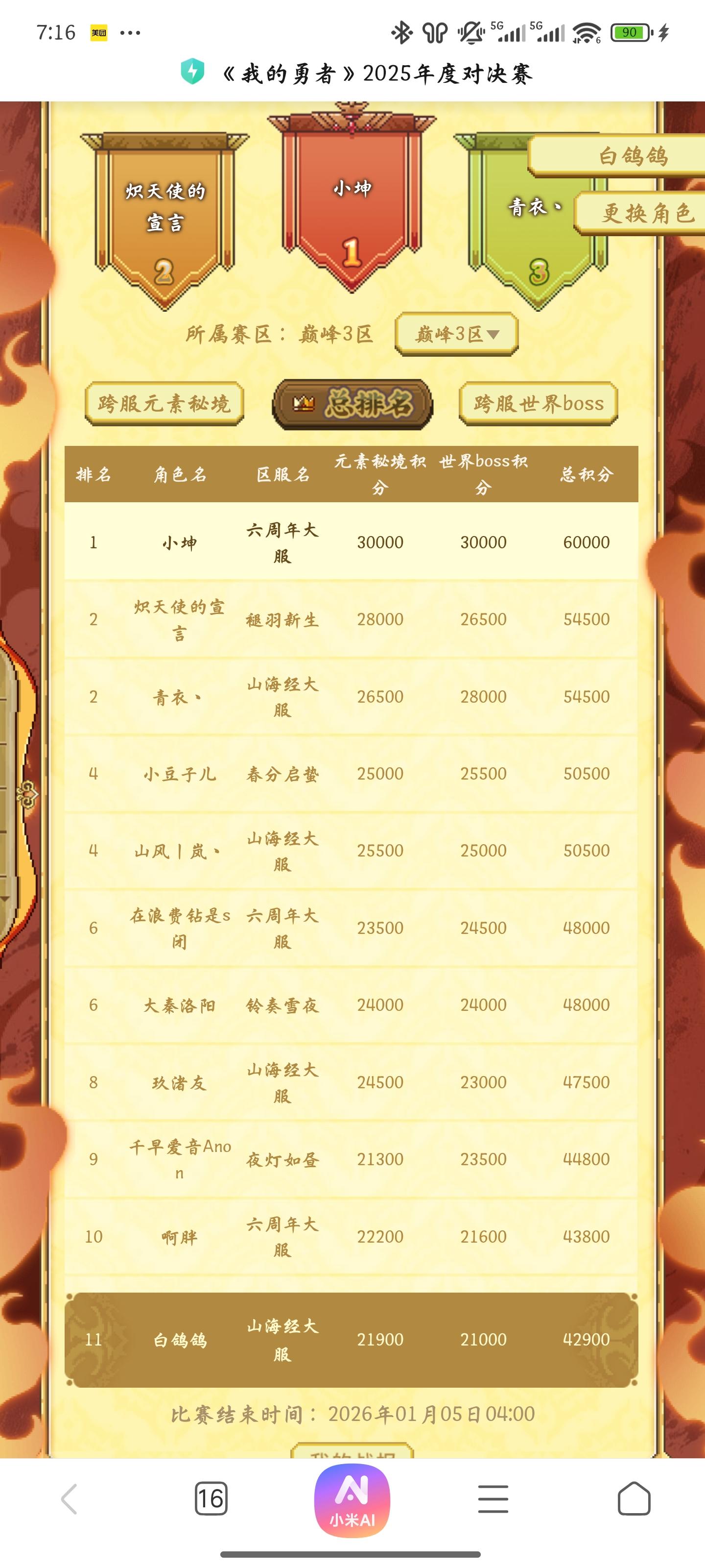 都这次跨服竟然有11名,而且这次我觉得非常感动跨服大秘境:前面是因为我自己打的太烂了,后面秦大爷说他帮我打,秦大爷打了两个小时,帮我提升了40秒,后面转钱大爷也是不收说都是哥们。后面又是小玖上我号,边调边打,一上号就是三个小时水系,帮我打到了56秒,也是转小玖钱小玖也不收,真的太感动了,还有豆包哈哈,有时候帮我算数据,真的玩这个游戏能认识你们真的太高兴了跨服世界:首先感谢无比帅气的瓜瓜神,还有