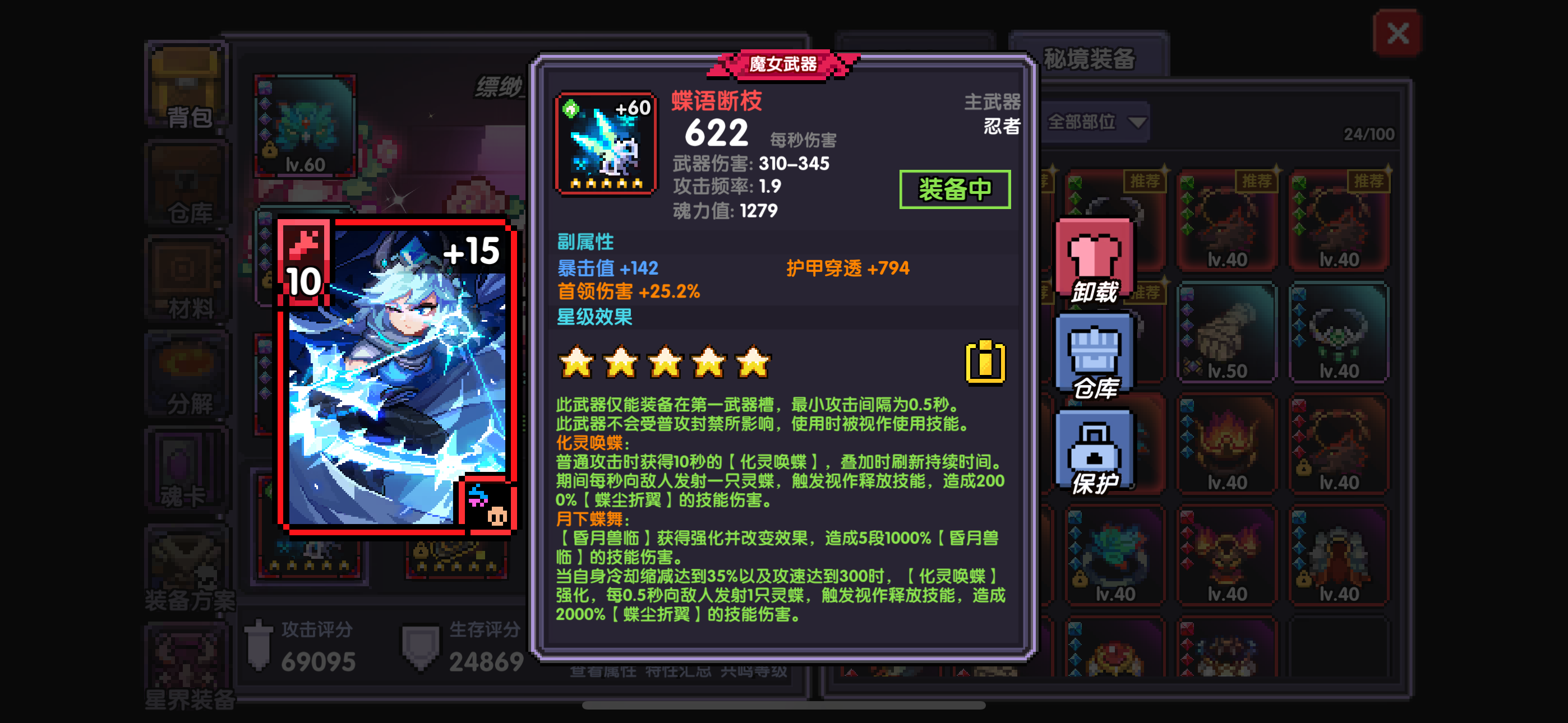 忍者武器袖剑•镜刺★ 木攻+30★★ 木攻+50★★★ 攻速+100★★★★ 装备沉影后每个分身为你提供40%技能伤害加成,至多120%★★★★★ 沉影和镜花水月开启后不再自动关闭普攻发射可在敌方目标之间弹射三次的镜片,每50攻速使镜片可额外弹射一次,至多弹射七次,弹射次数达到上限后镜片炸裂造成范围伤害史诗技能:沉影开启后进入[沉影]状态,获得两个分身,你每次普攻时每个分身分别