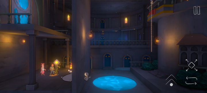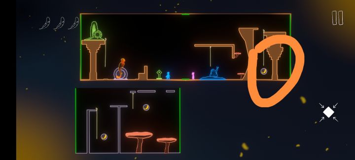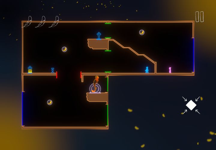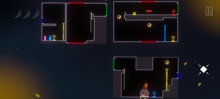 林朝 : 先把左下那个板块移开,让那个红色部分可以通行,然后蓝色小人朝左边走去推那个箱子,然后那个蓝色的屏障会升起来,粉色先把两个紫色的门重合起来,然后再调整走到蓝色最初那个位置,然后两个人一起站在箱子那儿,一个把箱子推开,一个站在门上面,就可以拿到上面的羽毛。然后再重合红色的接口让粉色的掉下来靠左一点就可以拿到空中的羽毛。把箱子推到楼梯口那儿,然后小人儿站着跳上去就可以拿到最后一根羽毛。