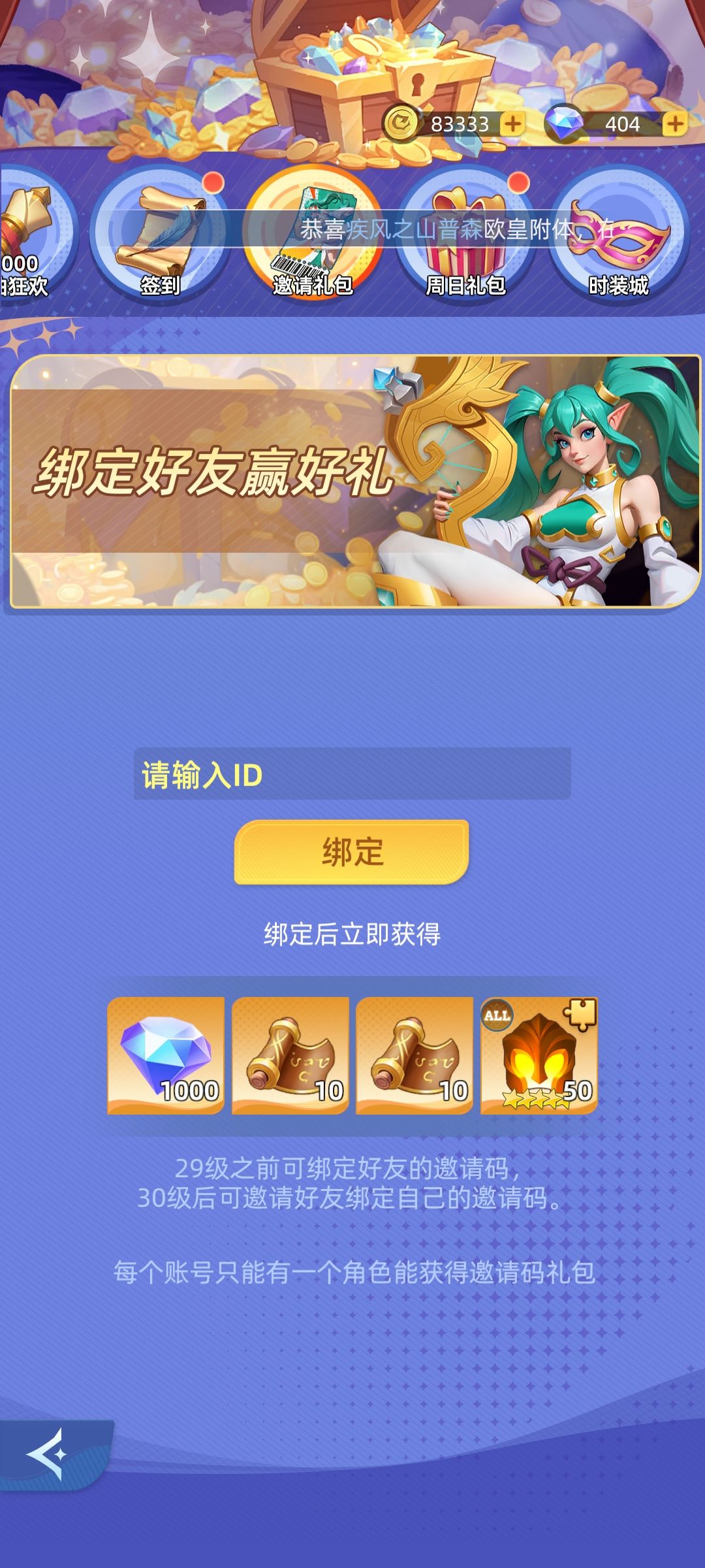 1.30级之前互绑邀请码(20抽+1000钻石+50英雄碎片) 2.30级之后跑新区发自己的邀请码,或者在社区找人绑定,但是目前游戏宣发有限,新区活跃人数越来越少。 (并且自己新区开的小号不能绑定自身的邀请码) 3.这边我也是询问了一个玩家,纯零氪,总共邀请了110个人,收获了280抽加6万钻石,他只有三个人达到了百万战力的要求,也就是说通过这个途径,你可以刷取大量的钻石和抽奖券,勉强比得上一个微