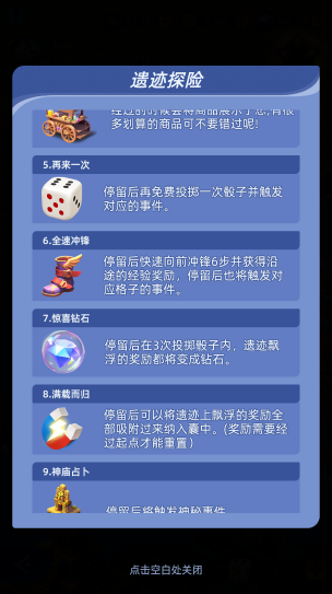 “惊喜钻石”“满载而归”与“神庙占卜”则更考验时机。“惊喜钻石”会在接下来三次掷骰期间把遗迹上漂浮的奖励全部替换为钻石,最适合在前路可见大量可吃的漂浮物时启用;“满载而归”允许你把当前圈内漂浮奖励一次性吸附纳入囊中,但需要经过起点才能重置漂浮内容,因此最好在一圈奖励已密集铺满、且即将完成整圈时踩中,能把价值最大化。“神庙占卜”会触发一些额外的神秘事件,具体收益不一,但通常都值得尝试,尤其在你资源充
