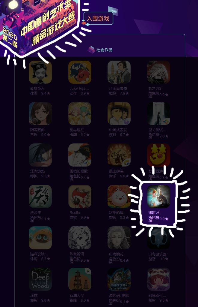 听说我们入围了 中国原创艺术类精品游戏大赛!请允许我用我拙劣的P图技术给将其他入围作品压暗并给我们自己加一个高光特效(5毛)~~