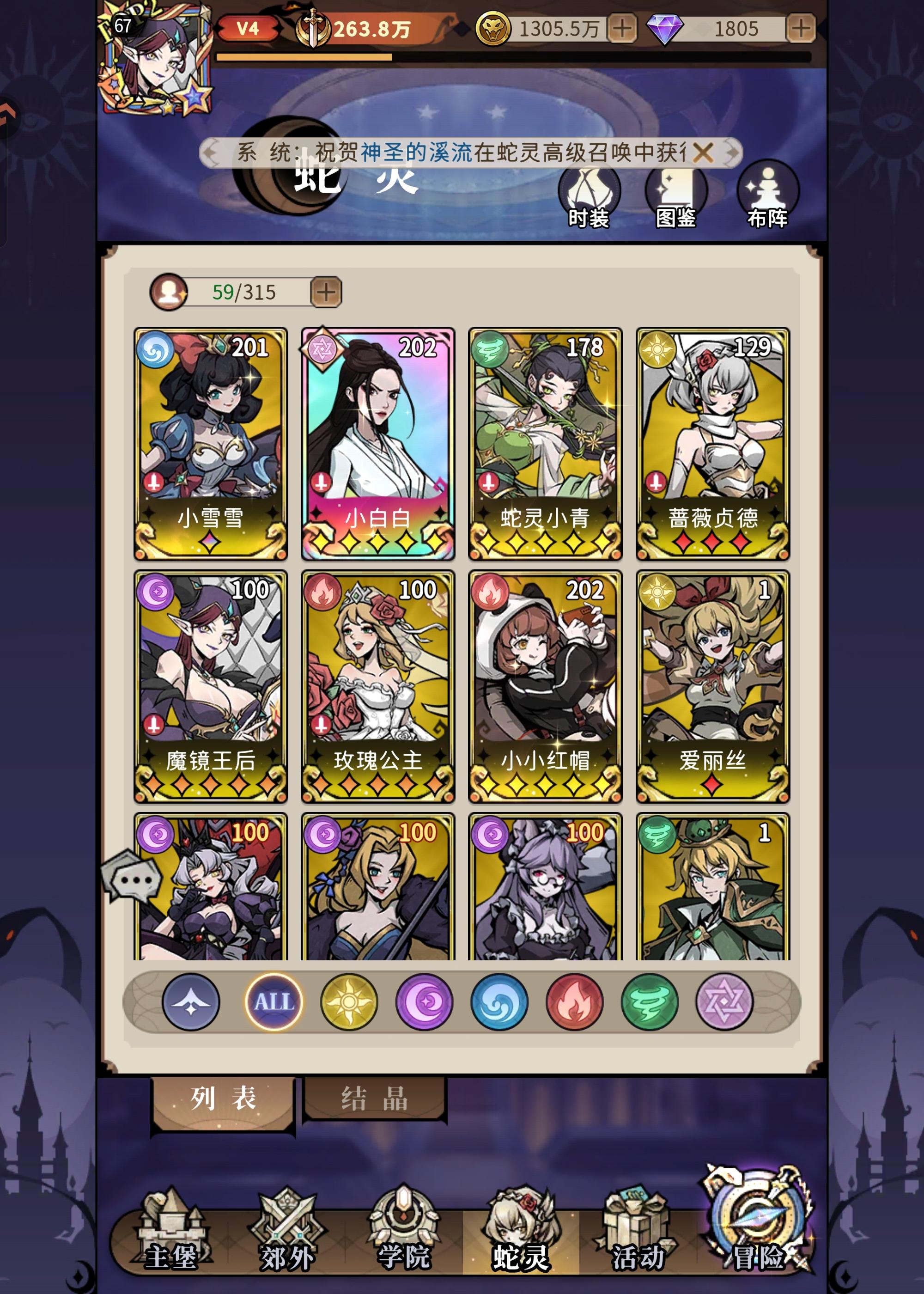 说说规划吧,大家也可以参考一下,目前我是4c因为白雪和小青要拿升星排行,加上王后还没升起来小白也是临时过度, 过度等王后升起来后面会用白雪和王后双c加蔷薇, 辅助用爱丽丝和玫瑰目前爱丽丝五个本体只是没有狗粮升, 玫瑰后面本体也容易获得,暗系全部给王后吃本体够了狗粮就不会缺, 第六个英雄用黑魔王前面有啥用啥, 建议大家也直接固定一个白雪加一个光暗c,辅助固定一个爱丽丝, 其他看个人喜欢, 有啥小问题