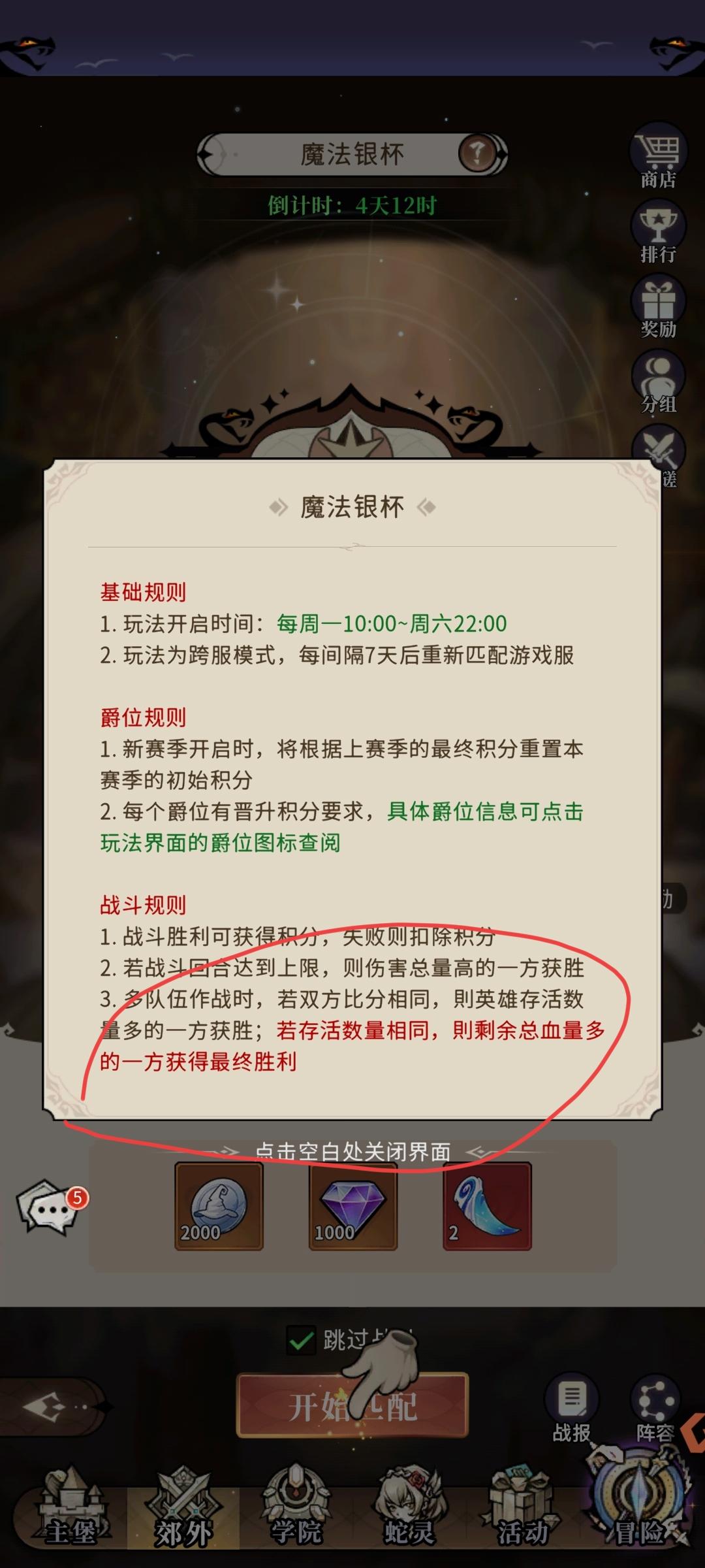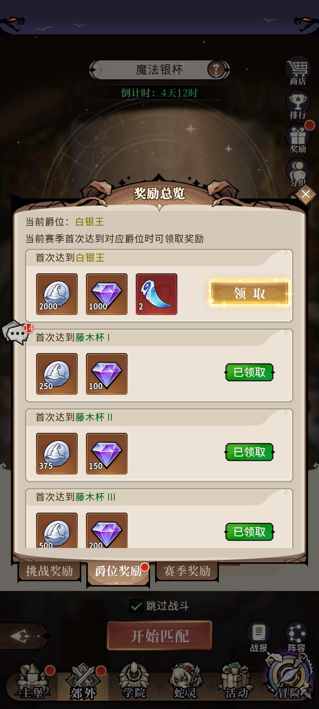 我刷了半个多小时才刷到白银王拿到奖励,这是第二次拿了, 有点小心得大家可以参考一下, 匹配的时候遇到相同的人有时候赢有时候输, 我把阵容换了一次又一次,发现最好用最好刷分的是把自己的主阵容放在一起, 另外一队只放一个英雄最好是带反击的或者是白马这种英雄, 我的理解是反击英雄可以消耗对方血量我用的王后打对方一波自己就送了, 这样对方无法回血结算的时候血量不是满的, 白马也是可以轻松消耗对面一波,类似