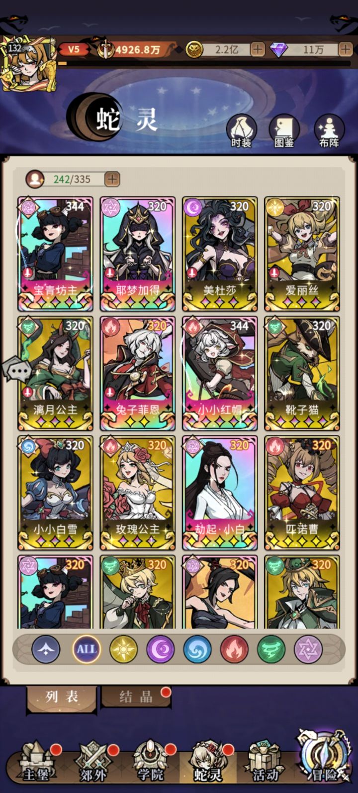 两个月的心得,V10以下,不要碰辉耀,兔子可以抽一下,其他都随便,光养爱丽思,可以留光盾,看你氪度,暗就美杜莎,跟宝青有技能联动,三系,留白雪链接宝青,前期随便升个20星,我的南瓜专武快紫二了,所以留着,我这套缺斩杀,其他打v12以下基本没缺点,火奶跟风奶那个多用那个,都20星后面比的是配件,包括龙纹,黑魔法,天赋,专武,徽章,弄的挺多,阵容多变,没有那套固定很厉害,看谁配件好,不一定是战力,我这
