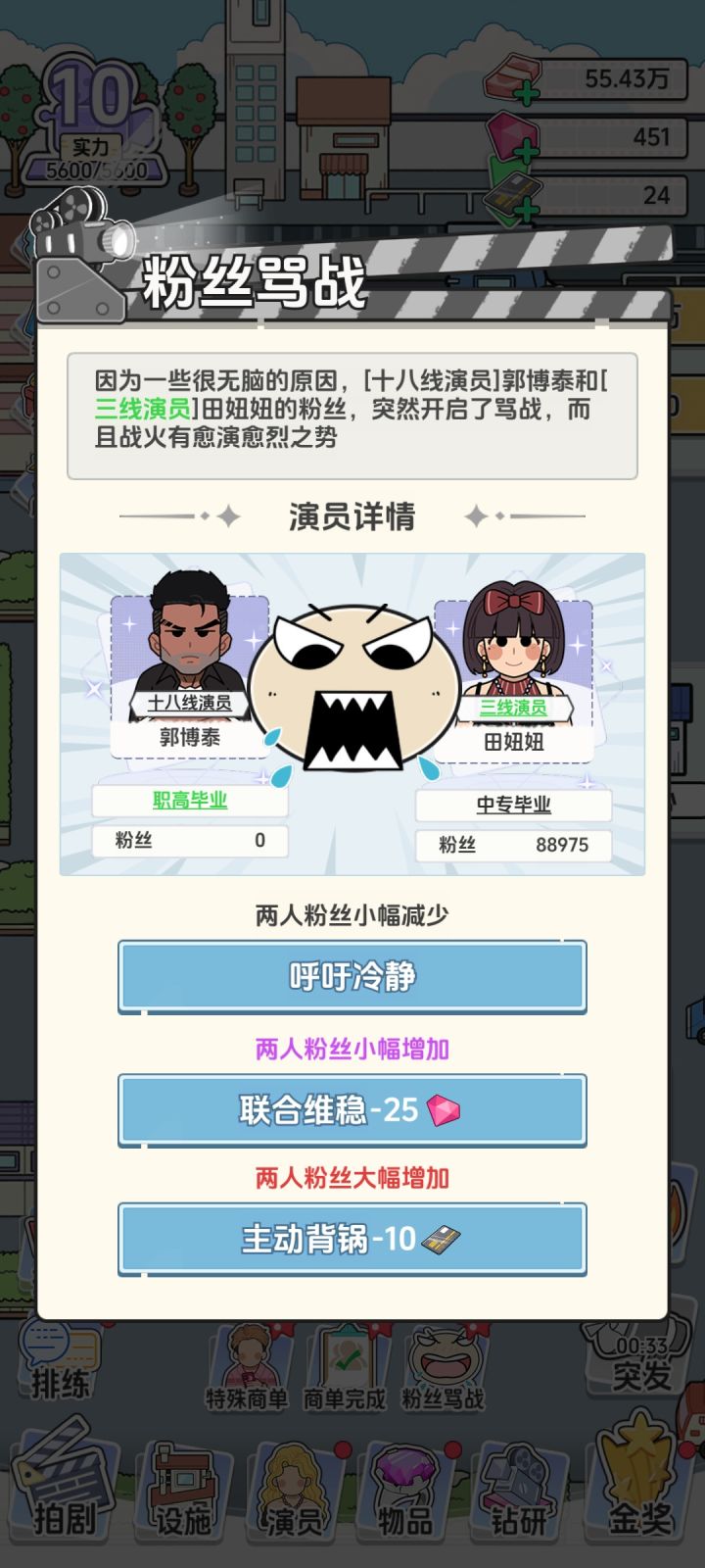 可玩性:⭐⭐⭐⭐⭐推荐程度:⭐⭐⭐⭐⭐在这里,培养新人,指导演员,激发他们的潜力,快速成长,从十八线小明星上升成为超一线大明星!还能处理突发事件,与粉丝互动,可玩性超高!#新游安利局 #我要拍短剧 #养成 #发现好游戏 #游戏日常