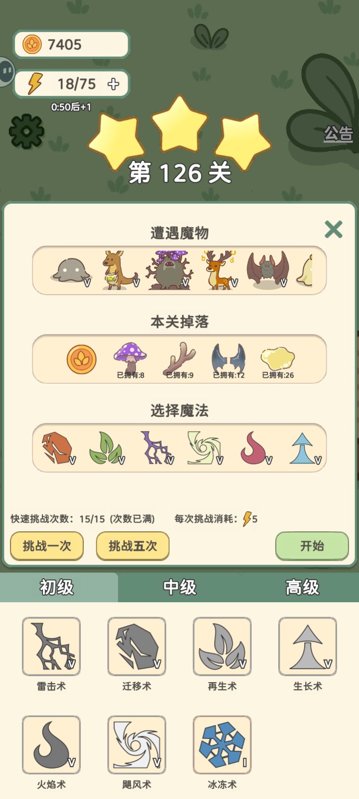 已经满星通关了,嘿嘿。游戏挺上头的,难度适中吧。第二张图是我的万用阵容,很好用。最讨厌那个减回合数的羊,经常需要玩两次才能满星过。104关卡了挺久,大概玩了10次左右才满星的。前期金币不够用,后期金币没有用,感觉进阶魔法没什么用,都不爱用。那个风魔法是后期很喜欢的一个魔法,很克那只鹿。