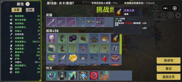 闪电鼠带轮刃出门,一直打到40波才遇到神器,然后近战转机械,浪费很多属性和道具,80波买满400道具,然后还是坚持到了110波,伤害完全不足了。