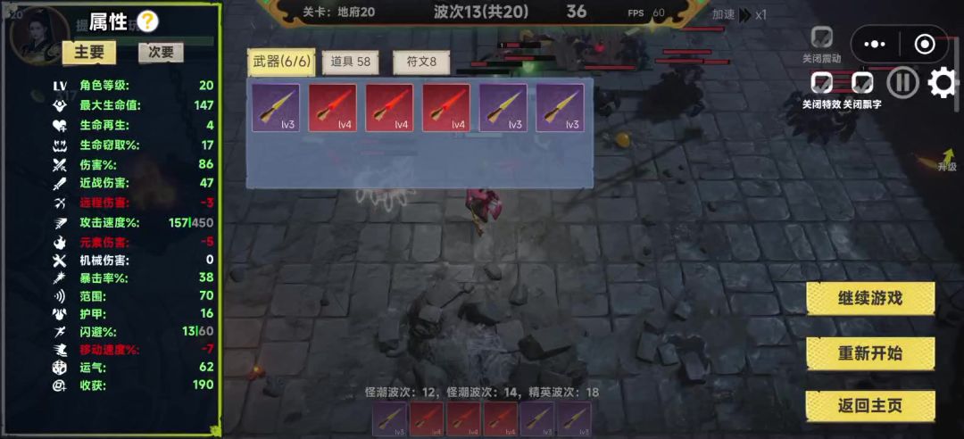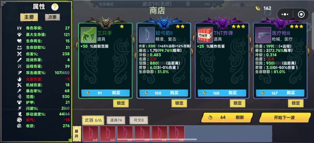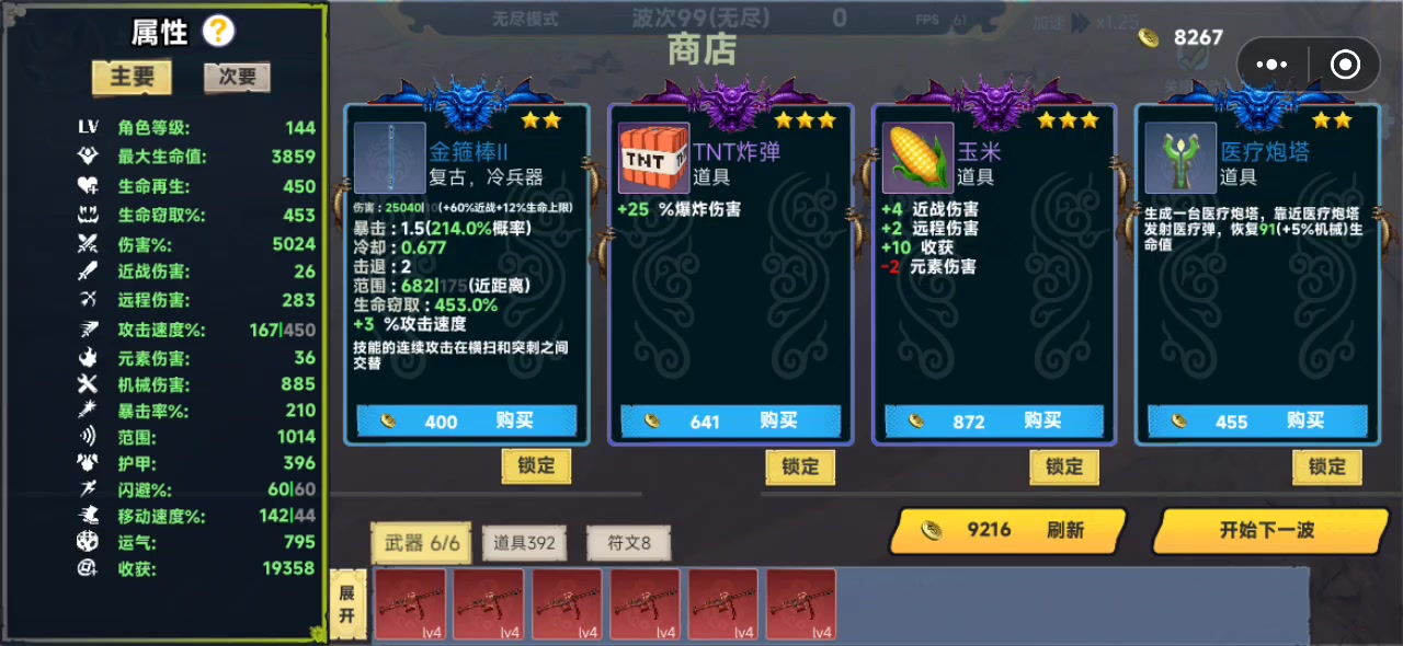 闪电鼠带轮刃出门,一直打到40波才遇到神器,然后近战转机械,浪费很多属性和道具,80波买满400道具,然后还是坚持到了110波,伤害完全不足了。