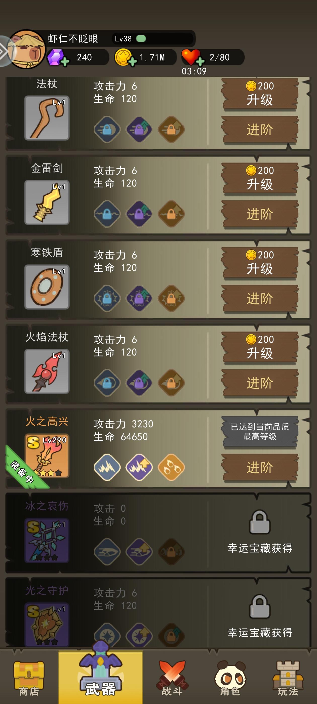 火之高兴的战力评分高,但是感觉不如法杖的伤害高,不过火之高兴➕烈火剑法的伤害,就很猛,还有小火球,对空有所弥补,虽然不如法杖对空强,但也说得过去,还有那个冰之哀伤和光之守护盾牌,有必要拿吗?感觉都有点鸡肋!谁给分析分析!顺便吐槽后期战力提升太困难了,不氪金寸步难行啊,全靠时间堆啊!吸血太重要了,又没有圣战头盔,每次技能选的不好了就过不去,第三波的精英怪太特么表态了!!!