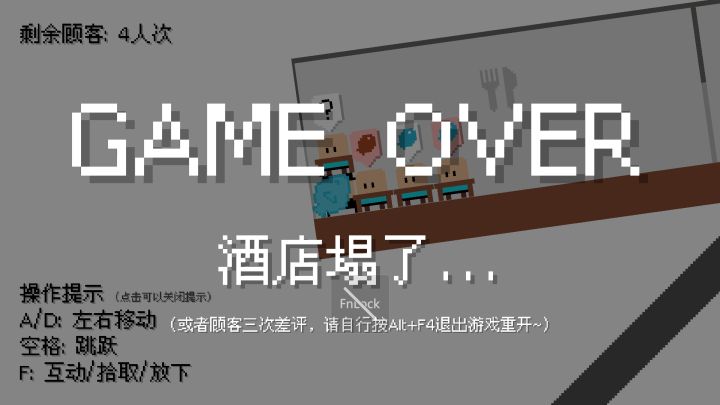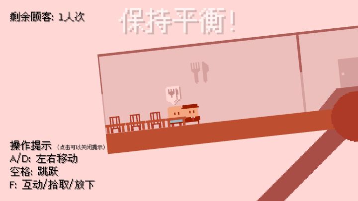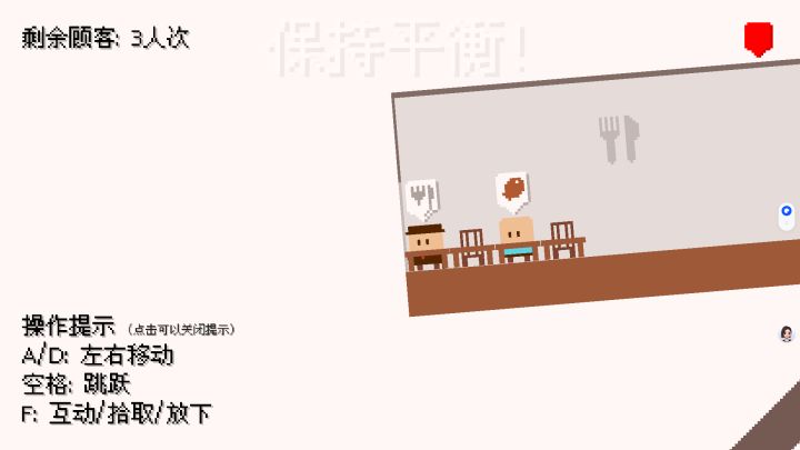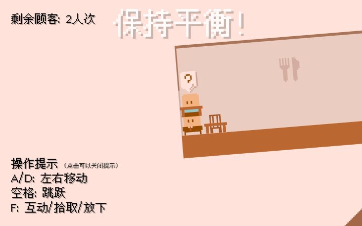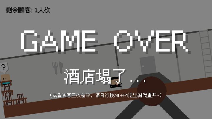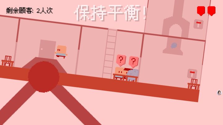 小人的运动也会影响到酒店的平衡,因为太过于紧张,所以没有观察到是固定座位还是随机座位,总感觉小人的行为在雪上加霜,总是走向东西多的那方,然后就只能托着坐在凳子上小人来回跑,非常的滑稽了。除此之外,小人的标识会随着时间逐渐变红,一旦等待的时间过长,小人就会不满意离开房间,离开房间的人过多也会游戏失败。