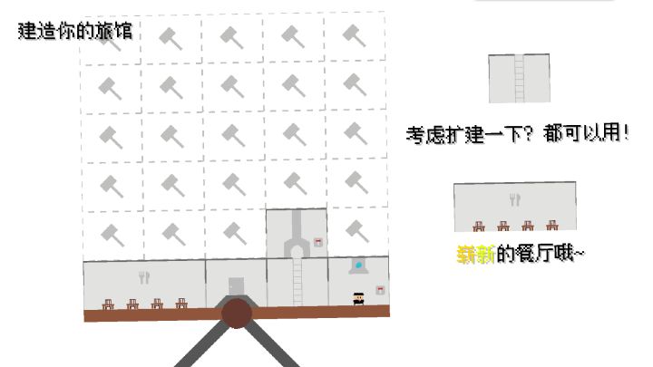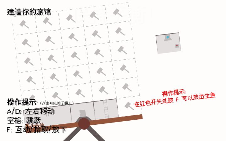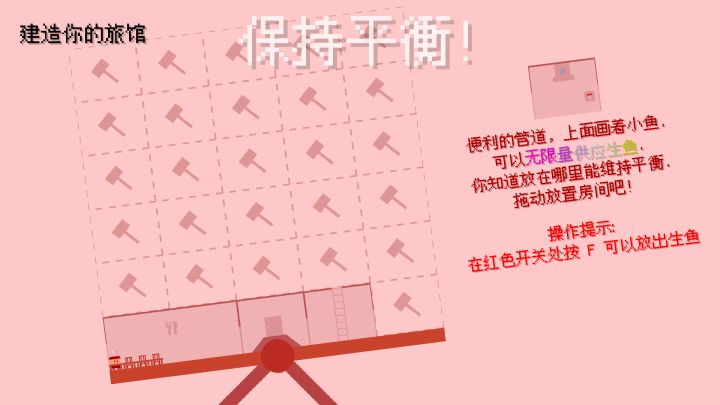 想要玩明白这个游戏其实也很简单,在现在这个版本,游戏内给出了六种房间。无限量的生鱼片房间,厨房,梯子房间,餐厅,无限量的苹果房间,组合苹果和鱼的苹果鱼房。首先房间的位置安排要尽可能平均,餐厅中的四个椅子是决定酒店是否平衡的关键之一,在一开始只有一个餐厅时,需要把两到三个椅子挪到另一边来保持平衡。小人在非厨房坐椅上时,不会点餐,会有问号。哪怕在餐厅里,但座位不在地上时,小人依然不会都点餐。厨房内能一次性加热在房间内的所有生鱼片,有大概30多秒冷却。在游戏中只能通过梯子房间上二楼,其他的房间都有房顶。苹果鱼房内能够用生鱼和苹果组合制作出制作生鱼苹果鱼,熟鱼和苹果组合成熟鱼苹果鱼。我每次都只放一个苹果和一个鱼,没有尝试过在房间内放置多个道具会发生什么。
