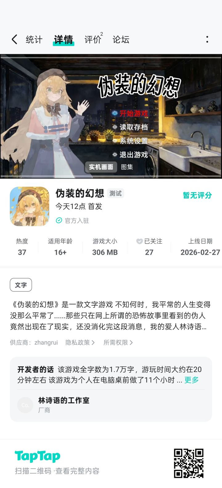 最近放假轻松不少,做了游戏在Taptap上,虽然游戏性一般,但还是小有成果,于是折腾了个印象曲 完整版会试着发网易云(等再有空再说) 歌曲由sunoAi制作 下一篇不是名著改编,也是跟“幻想家”有关的作品,大概一两万字,总流程10分钟左右的文字游戏,会争取在这个月内搞定