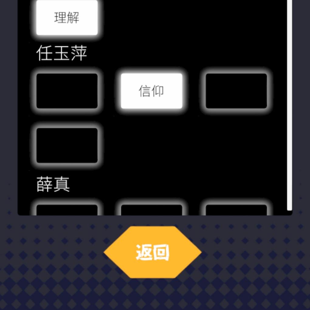 由于漏选了林师兄瘟疫的选项,我离真相一直很远——这样的“我”死了二十多次,都没有崩溃,虽然背景在不断变得冷漠,我以为能通过触发主角意志的溃散,再得到新的词,于是开始尝试用残忍的罪名给大家判刑,以求得进展……我第一次给林师兄安上杀人放火的罪行时,不知道是不是幻觉,我看见“我”露出不属于那张脸的笑,说出附上这般面具才能说出的话——只出现过一次——所以应该是我的幻觉吧,再试时,选择那些子乌虚有罪名时,
