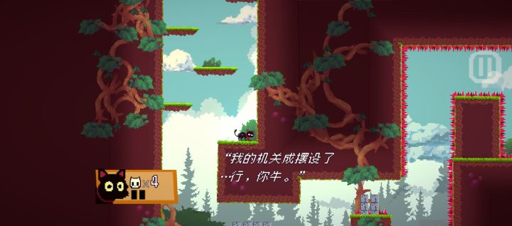 2D像素画风,界面结构简单,没多余的UI,通关过程中甚至还会利用到UI。主角成了猫,而勇者被卡在墙缝里出不来,设定带有离经叛道的意味。场景结构很清晰,踏板位置很好理解,也很容易找到。猫的各种技能效果很突出,每一个区域都有一个技能主题,由存档点进行切换,设定很合乎情理。