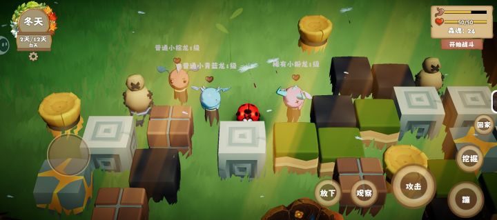 萌新注意事项1.饥饿值—虫虫攻击树木能掉下苹果,贴近苹果点击观察,选择吃后,右边会出现个嘴巴👄,反复点击嘴巴就可以补充2.泥块的话实测用处不是很大,个人建议用玩偶替代泥土,挖掘的时候尽量在地图的边缘上挖掘,挖掘需要在原地点四下左右直到爆物,如果不是自己要的东西,就往左或者往右移动,直到他不提示。暂时无法挖出东西位置,玩偶放在家周边就行,入侵者会主动攻击玩偶3.守家首要推荐还是龙蛋,龙蛋这个爆