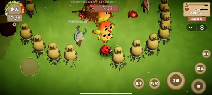 萌新注意事项1.饥饿值—虫虫攻击树木能掉下苹果,贴近苹果点击观察,选择吃后,右边会出现个嘴巴👄,反复点击嘴巴就可以补充2.泥块的话实测用处不是很大,个人建议用玩偶替代泥土,挖掘的时候尽量在地图的边缘上挖掘,挖掘需要在原地点四下左右直到爆物,如果不是自己要的东西,就往左或者往右移动,直到他不提示。暂时无法挖出东西位置,玩偶放在家周边就行,入侵者会主动攻击玩偶3.守家首要推荐还是龙蛋,龙蛋这个爆