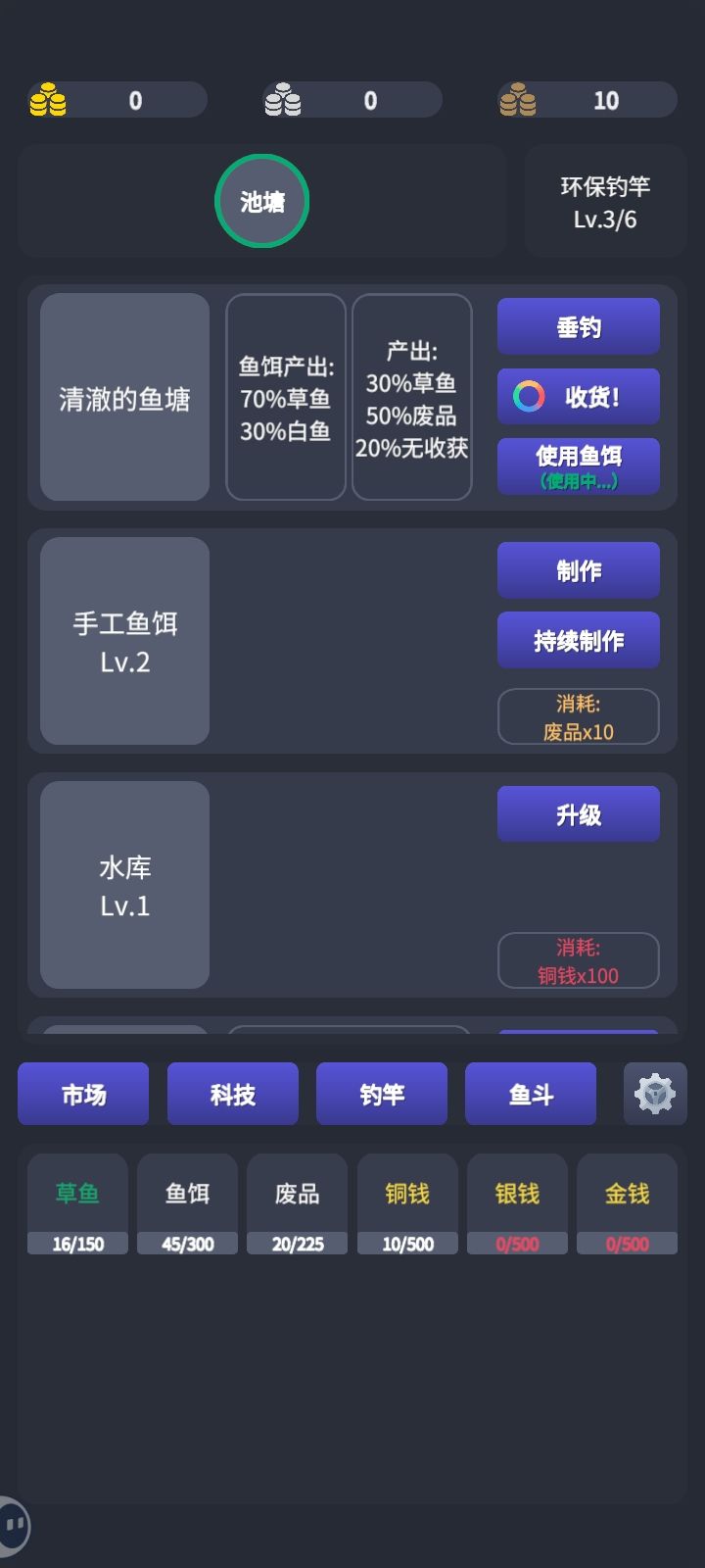 虽然说前期折磨了一点,但是等级提上去之后还是很轻松的,建议可以给鱼饵增加一个升级系统,比如升级增加鱼饵容量,减少消耗,提高生产效率什么的。