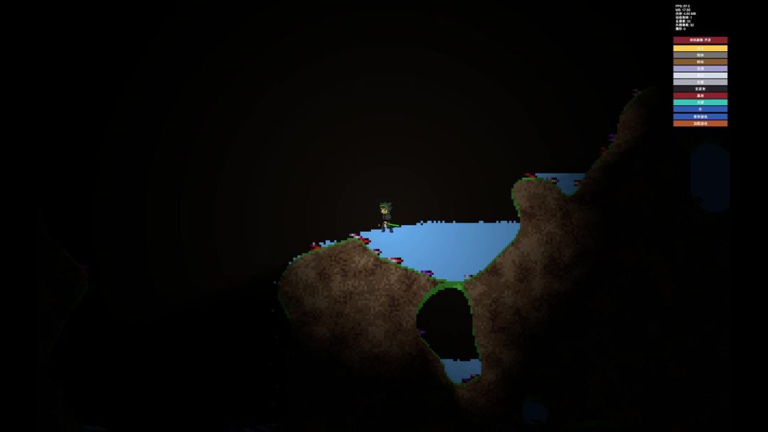 游戏中目前的区块内有20*20*4*4的像素块,对此我研制了一套可以模拟固体和液体的0.1代模拟引擎。 新引擎支持无限世界和动态区块加载理论可以替换游戏中目前的水源方块了。所有粒子是完全独立的,且拥有自己的行为逻辑。可以自由绘制创建固体、液体、气体和角色单位。 粉色的物体就是角色的碰撞体(也是像素引擎中重新实现的),可以实现高性能像素刚体碰撞、通过液体等。同时空气模拟可以在液体中产生气泡,模拟液体