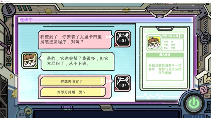 每位患者就相当于一个关卡,有些并不需要解谜,只选择对话选项即可,另外一些需要进行解谜,整体内容量大概一小时内可通关,有点意犹未尽。