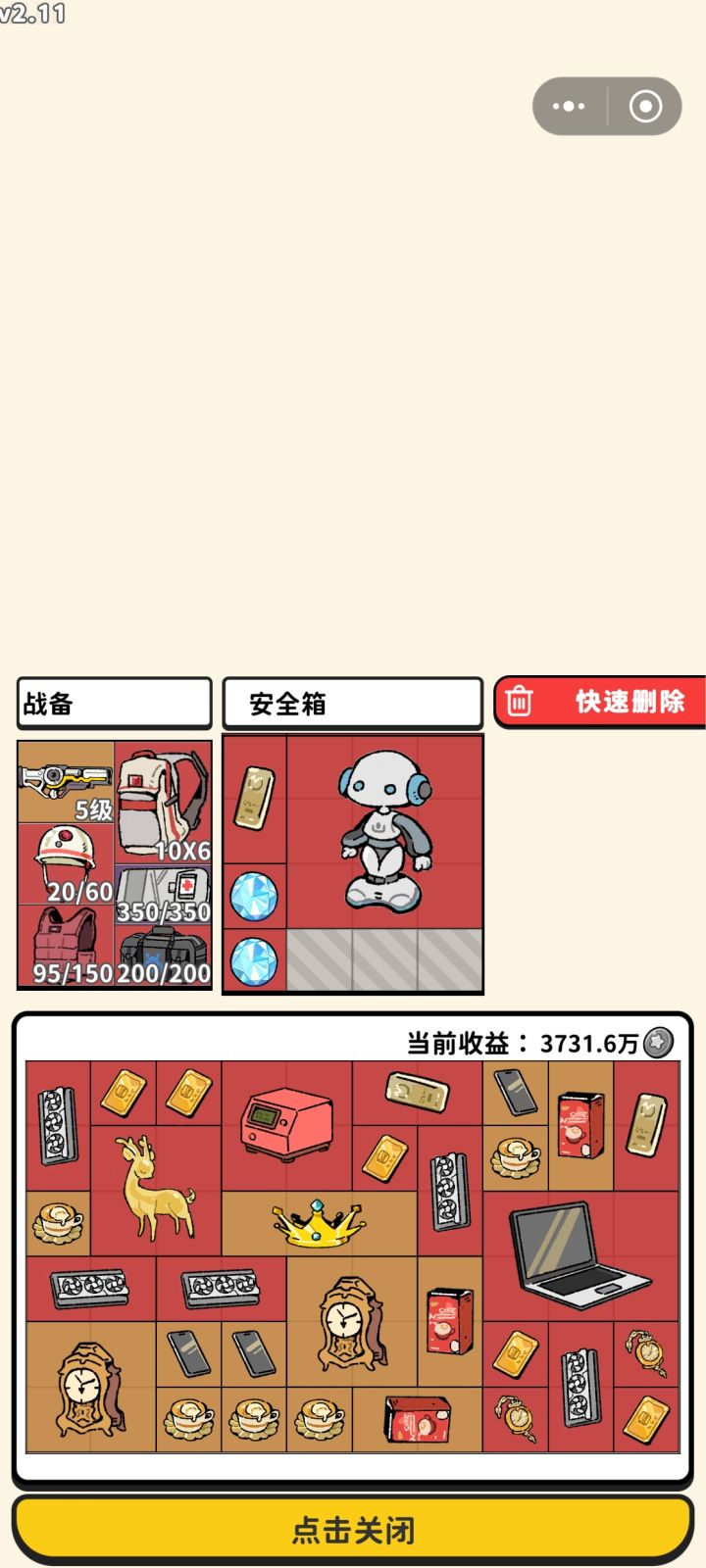 1.满耐六甲200w税后150w,单格93750,>任意金色变卖物税后单格价值,所以捡十六格金不如抗一件甲。金枪税后单格七万多,六级包税后单格价值>一格小咖啡,所以捡一裤兜子咖啡不如捡背包。满耐红修税后价格>瞪羚,所以优先攒星星币都可以考虑一下背哪些东西了。2.在搜索容器的时候点击快速删除→快速选择→确定删除可以直接删除检索出来和未检索的蓝绿白物资,如果你再退出容器重新打开容器,就可以省略搜索蓝