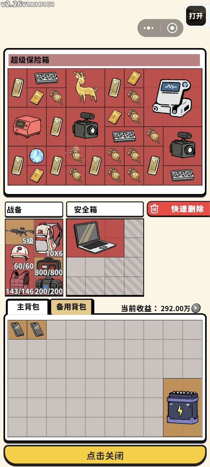 前两张照片是在同一局中开出的两次大红雨,最后吃不下了,还留了一堆怀表和金条在那里,撤离价值5000万(最后一张图)