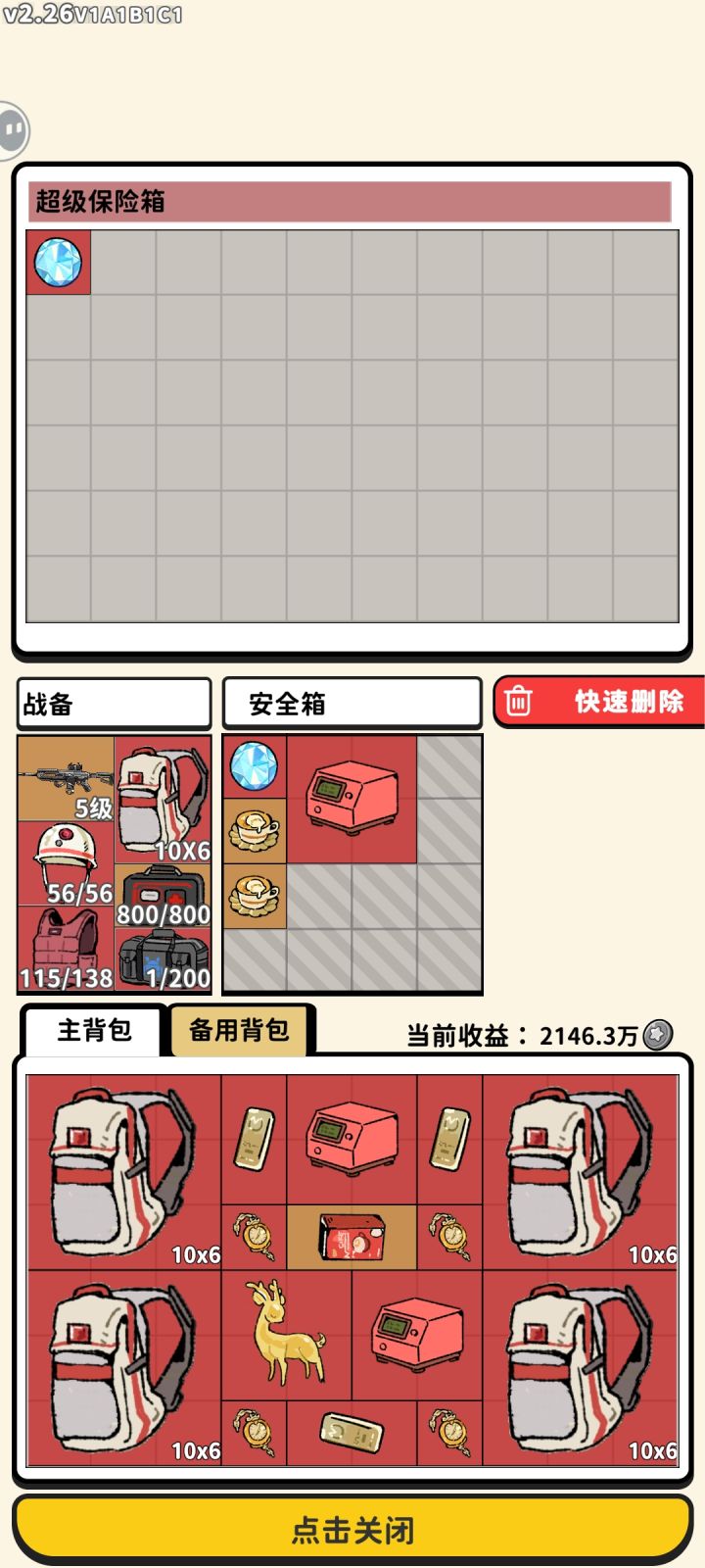 前两张照片是在同一局中开出的两次大红雨,最后吃不下了,还留了一堆怀表和金条在那里,撤离价值5000万(最后一张图)