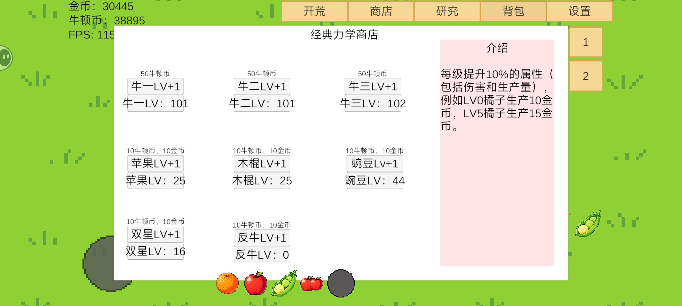 游戏里有很多负体验项已经到了不能用bug之名遮掩过去的程度。屏幕左边的移动按钮太小且距离屏幕底部过近操作不便,屏幕右边的种植按钮不仅没多少实际用处还会干扰移动,商店里的橘子升级在扣除金币的同时没显示等级变化还把生命升级加了一,一些升级项目在拿了我钱之后还不给我升级,牛顿第二定律升级描述是扣除50牛顿币但实际上不仅扣了牛顿币还扣了金币,人物攻击方向判定不灵活有时候切不了近在咫尺的菠萝,左侧屏幕常驻空气墙金币飞进去了就捡不到。